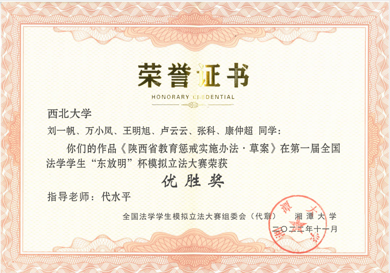 日前,由中国法学会立法学研究会指导、湘潭大学主办的第一届全国法学学生“东放明杯”模拟立法大赛举行决赛。西北大学参赛队从初选阶段的405份作品中脱颖而出,进入全国100强,最终在决赛阶段荣获优胜奖。