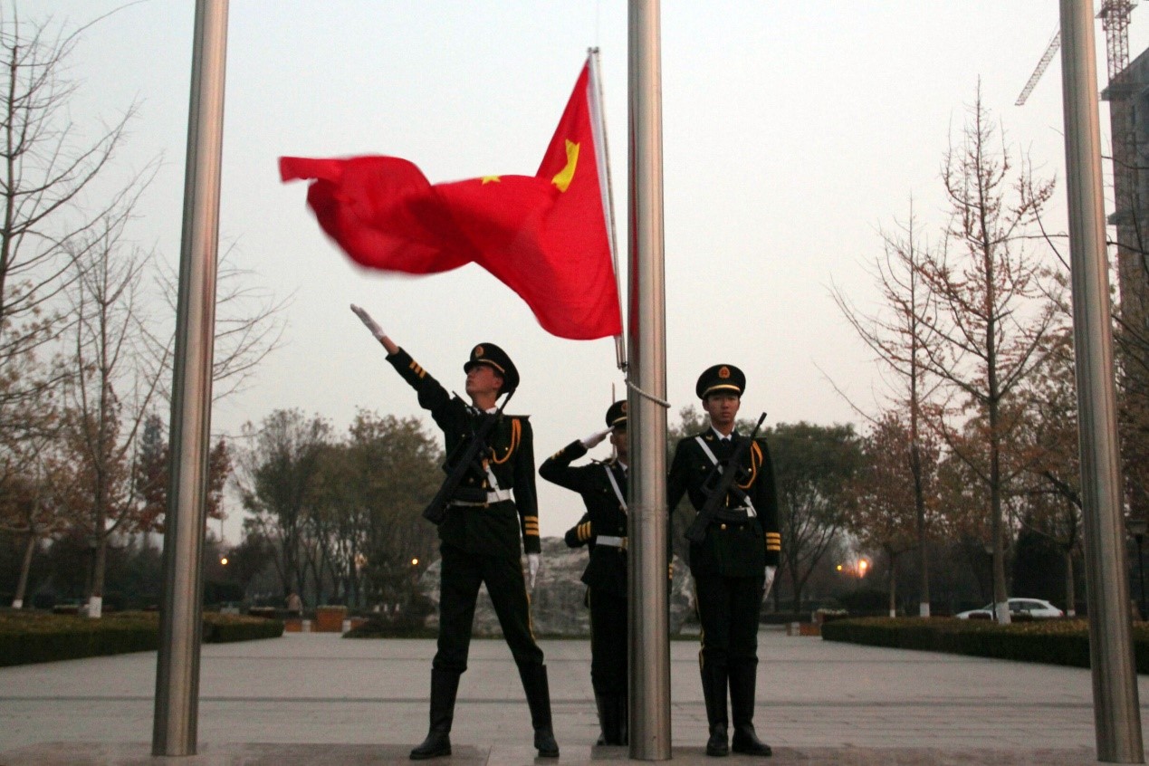 国护队踏着整齐的步伐护送国旗,伴随着庄严的国歌声,五星红旗冉冉升起。