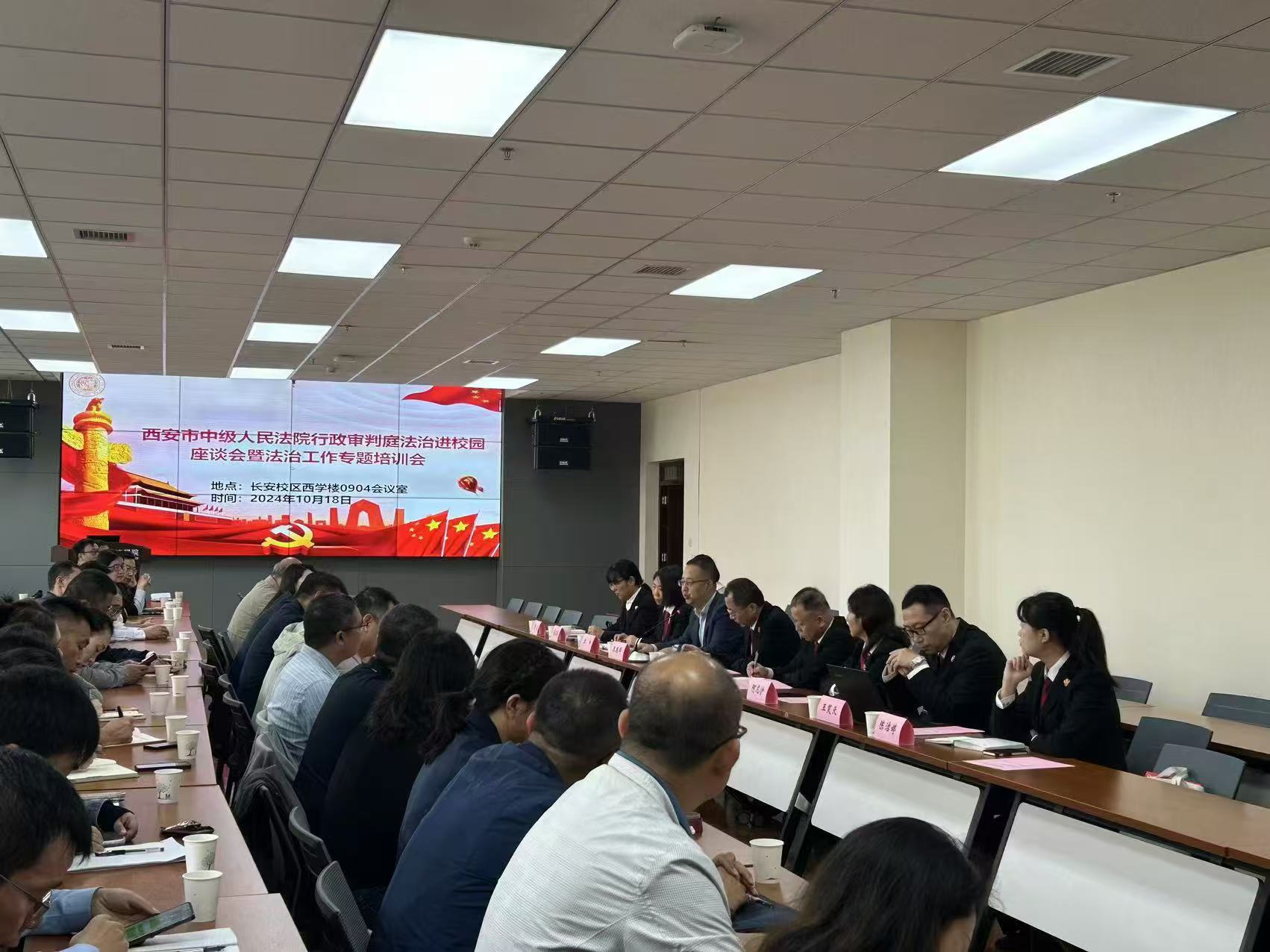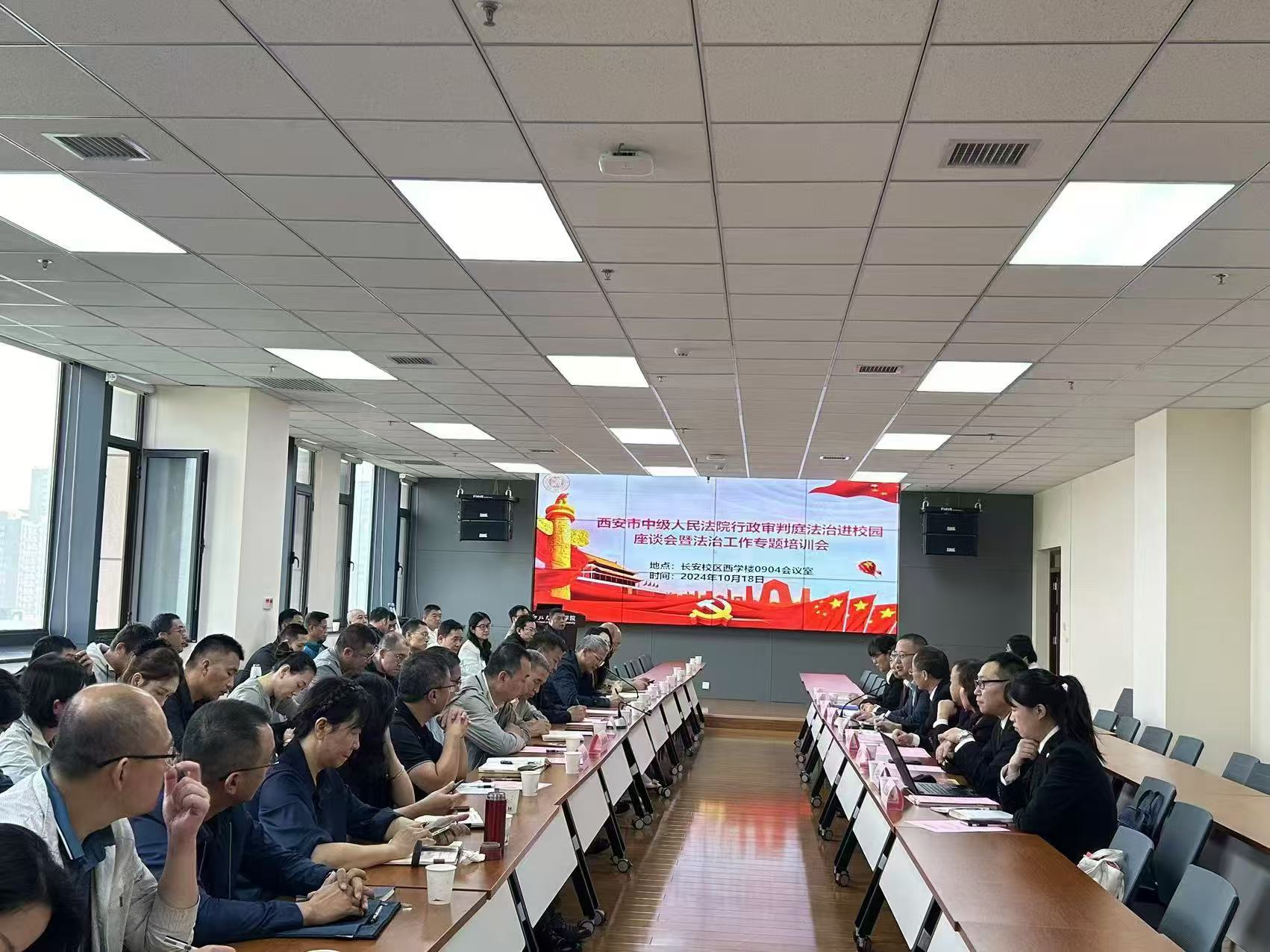 2024年10月18日上午,西安市中级人民法院行政审判庭法治进校园座谈会暨法治工作专题培训会在永利集团长安校区举行。西安市中级人民法院行政审判庭庭长崔立新,副庭长崔志刚、阿尼沙,王峰、王笑天、刘春梅、陈洁婷等四名员额法官,书记员常欣,学校党校办(法治办)、人力资源部、保卫部(处)、教师发展中心、经营资产公司、中华文化干部学院负责人,后勤集团副科级以上干部及各院(系)行政副院长(副主任)等参加会议。会议由永利集团负责人主持。