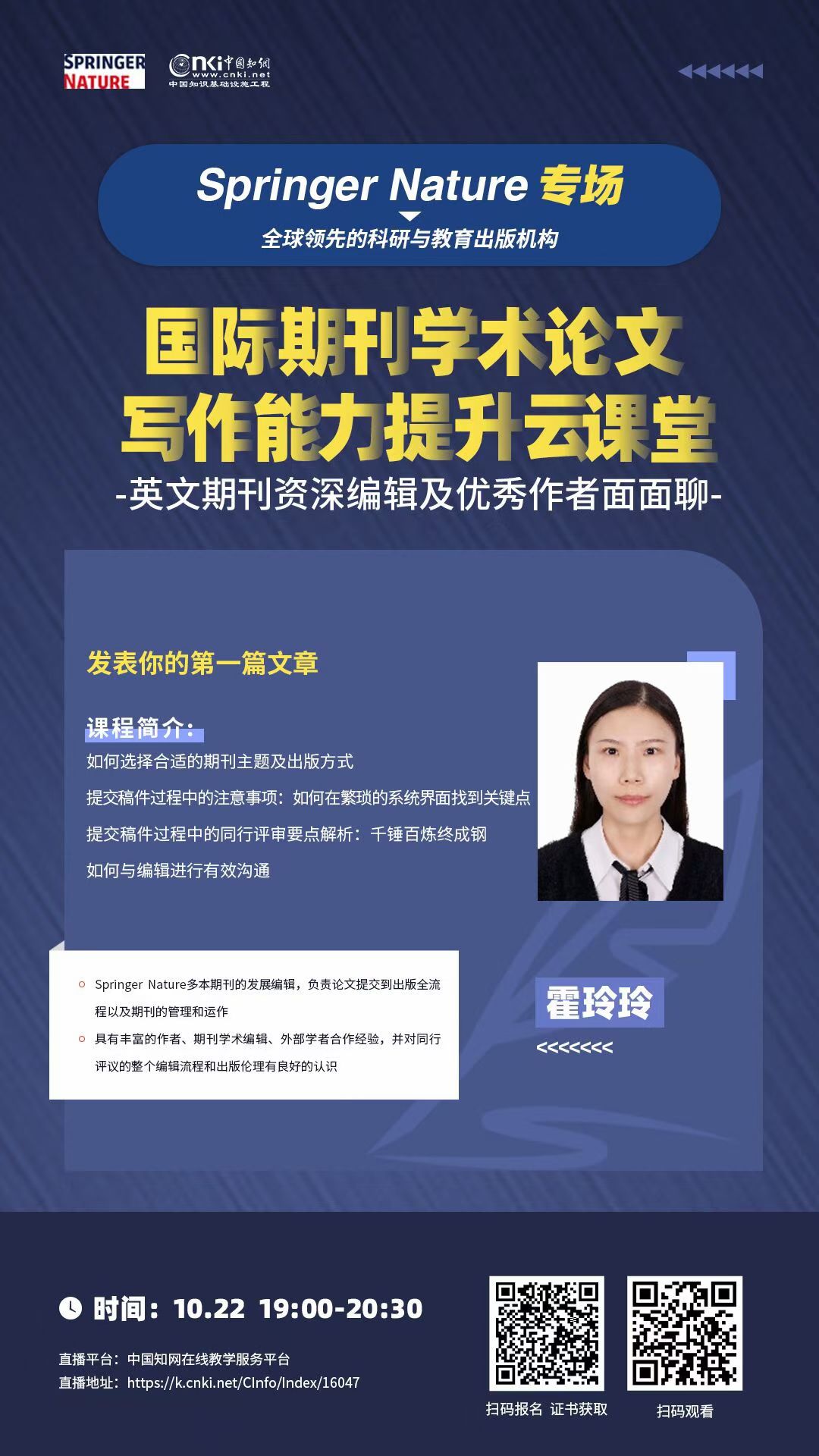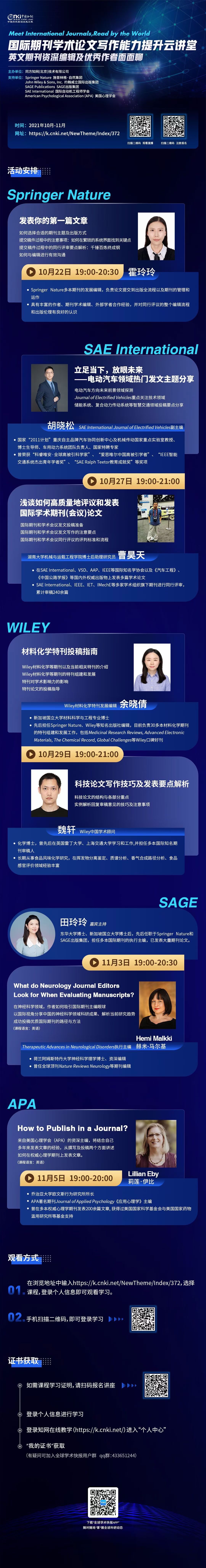 “国际期刊学术论文写作能力提升云讲堂”,举办方中国知网、Wiley,Springer Nature,SAE,SAGE,APA。活动时间为2021.10.22-2021.11.15,共计五讲报告。第一场Springer Nature的报告于10月22日(本周五)晚19:00在知网在线教学平台进行直播。https://k.cnki.net/CInfo/Index/16047欢迎各位老师和同学准时收看!(联系电话:88309028)
