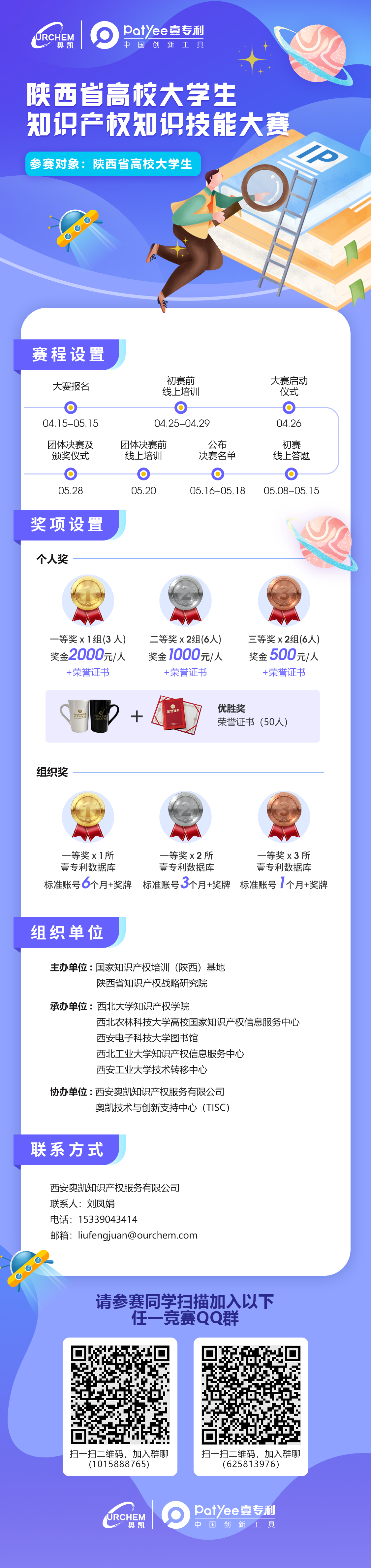 在第22个世界知识产权日来临之际,为贯彻国务院印发的《知识产权强国建设纲要(2021-2035年)》文件精神,增强在陕高校大学生的知识产权保护意识,提升高校青年大学生的科技创新保护能力,国家知识产权培训(陕西)基地和陕西省知识产权战略研究院将联合主办“陕西省高校大学生知识产权知识技能大赛”。本次比赛将由西安奥凯知识产权服务有限公司提供奖金和证书赞助,并由奥凯技术与创新支持中心(TISC)对获得组织奖的单位提供一定期限的壹专利数据库使用账号的奖励。欢迎广大在陕高校大学生扫码进群,了解赛事进程,并积极准备,按通知要求参加比赛。