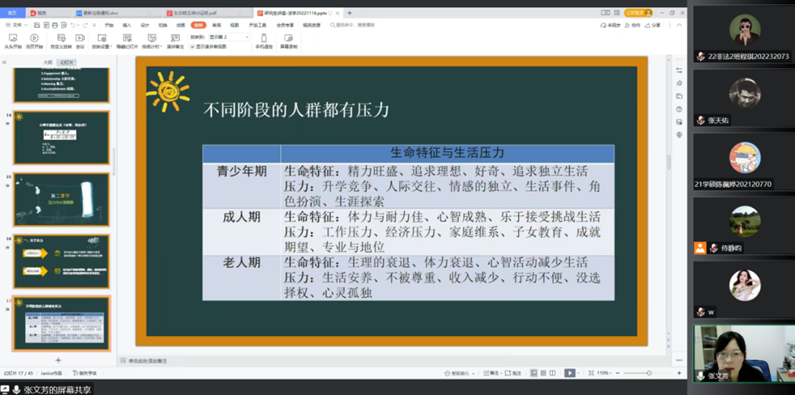 接下来,张文芳老师以生活实例向大家介绍不同年龄阶段群体面临的压力、压力对健康的影响、压力适当论等内容。在不同时期人们会有不同的压力,而研究生群体面临的压力更是繁重。张老师着重讲解了过度压力对身体造成的恶劣影响,并教大家一些缓解压力的办法以及如何去管理压力。
