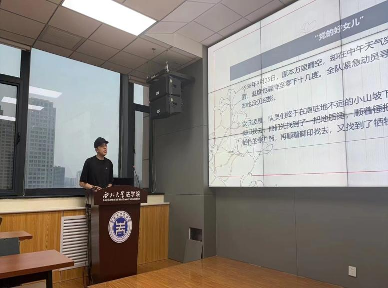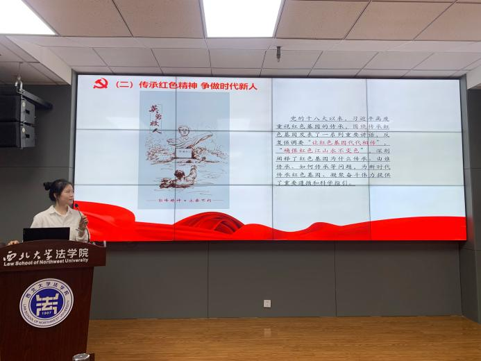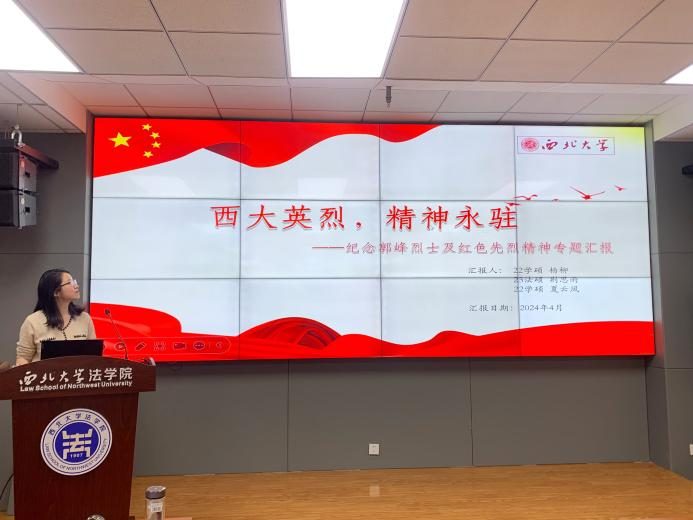 2024年4月23日,第二组同学以“西大英烈,精神永驻”为主题做了纪念郭峰烈士及红色先烈精神的专题汇报,首先,研习社成员介绍了郭峰同志的生平和救助落水女工的事迹,歌颂郭峰烈士不顾自身安危,爱国爱民、无私奉献的精神内涵。其次,讲述了红色基因在“一站式”学生社区文化建设中的重要意义。最后,提出要结合党史学习教育,充分运用红色资源,赓续红色根脉,弘扬法治精传承红色基因的实践路径。