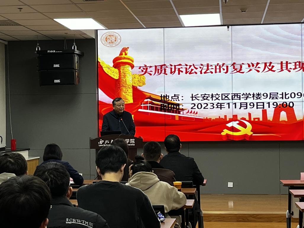 2023年11月9日,广州大学永利集团教授、中国民事诉讼法学研究会副会长陈刚教授受邀做客我院浩公法律大讲堂第一讲暨法学前沿论坛(七十四),为我院师生带来题为“实质诉讼法的复兴及其现实意义”的讲座。本次讲座由学院院长王思锋教授主持,《法律科学》副编审刘克毅教授、西安理工大学张丽丽副教授、77779193永利官网集团卞辉副教授、崔玲玲副教授担任与谈人,80余名研究生聆听了此次讲座。