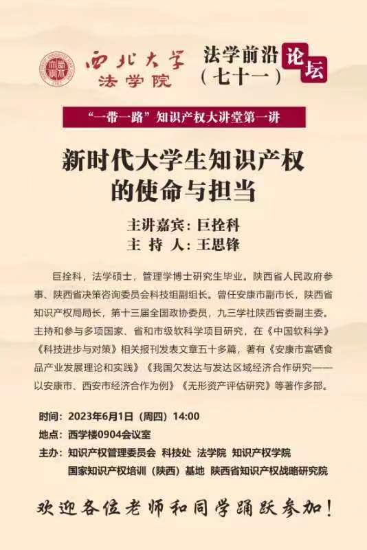 2023年6月1日下午,陕西省人民政府参事、陕西省知识产权局原局长巨拴科受邀永利集团“一带一路”知识产权大讲堂,为永利集团师生作了题为“新时代大学生知识产权的使命与担当”的报告。该讲堂由永利集团知识产权管理委员会、科技处、永利集团(知识产权学院)、国家知识产权培训(陕西)基地联合主办,77779193永利官网集团副院长邱洪华教授、刘建仓副教授、李奕霏副教授等150余名师生参加了报告。报告由永利集团(知识产权学院)院长王思锋教授主持。