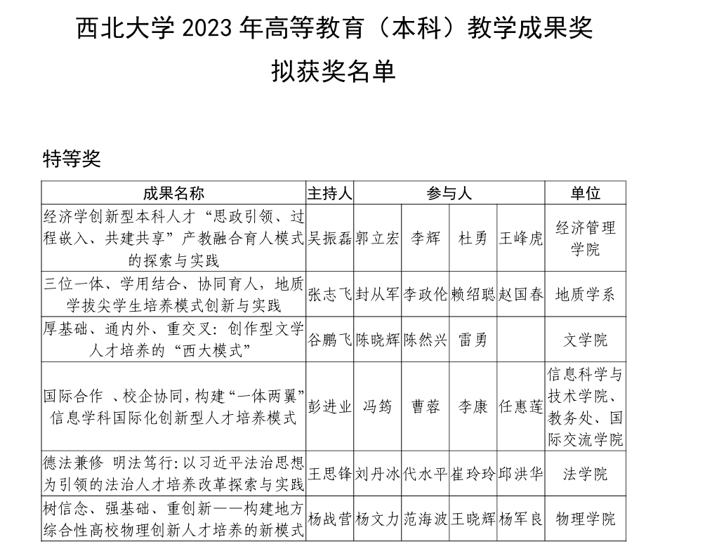 近日,学校教务处公布了《永利集团2023年高等教育(本科)教学成果奖拟获奖名单》,该名单已过公示期。我院王思锋教授带领团队申报的教学成果德法兼修 明法笃行:以习近平法治思想为引领的法治人才培养改革探索与实践获特等奖。该项教学成果是近年来永利集团本科人才培养工作和教育教学改革中凝练的重要成果,此次获奖,是对永利集团本科人才培养工作和教育教学改革的肯定。接下来,学院将进一步做好下一阶段本科教学成果的培育和组织工作,持续为学校本科教育改革与发展积累经验。