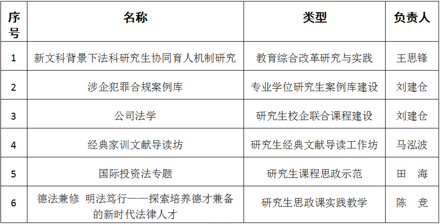近日,校研究生院公布了2023年度研究生培养质量提升项目立项名单,我院获准项。其中,王思锋教授申报的新文科背景下法科研究生协同育人机制研究获批教育综合改革研究与实践项目刘建仓副教授申报的涉企犯罪合规案例库获批专业学位研究生案例库建设项目公司法学获批研究生校企联合课程建设项目马泓波副教授申报的经典家训文献导读坊获批年研究生经典文献导读工作坊项目,田海副教授申报的国际投资法专题获批研究生课程思政示范项目团委书记陈竞申报的德法兼修 明法笃行——探索培养德才兼备的新时代法律人才获批研究生思政课实践教学项目。上述项目的立项建设将有力促进我院研究生教育教学改革,提升研究生培养质量。