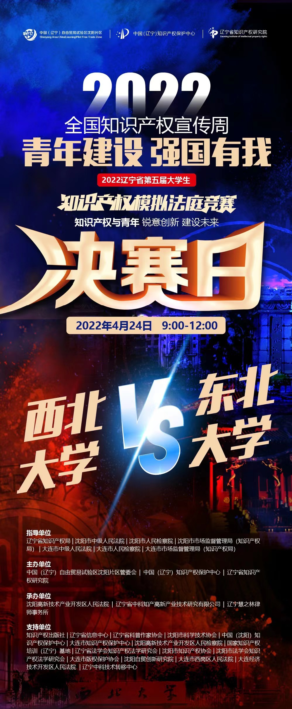 22个世界知识产权日即将来临,2022年辽宁省第五届大学生知识产权模拟法庭竞赛于417日至424日采用云端开庭、同场竞技、全程直播的形式顺利开展。