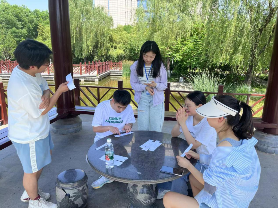 参赛同学在A点进行了你画我猜的小游戏,两组同学分别进行,各自挑选题库,以规定时间内答对数目多的一方获胜。两组同学用尽各自的肢体语言,传达词语意思,过程中欢声笑语,也有一些默契十足的搭档,取得了良好的成绩。