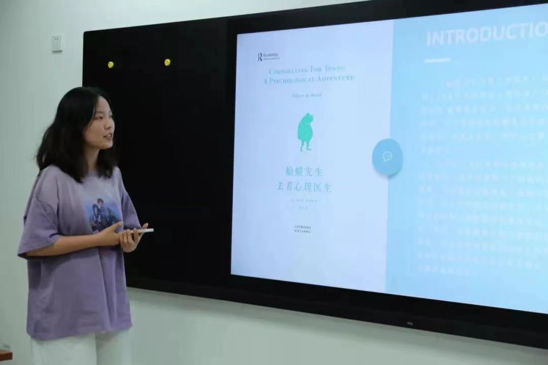 21级苏新悦同学从作者简介入手,就章节内容、专业解释、语句摘录三方面为大家整体介绍了一本关于心理咨询的心理疗愈读物《蛤蟆先生去看心理医生》,给大家展现了经过一次次心理咨询后,人们行为和情绪的控制、疗愈和改变的发生、人生和意义的领悟。同时,向大家表达了我们每一个人都应该勇于探索自己的内心世界,去寻找深入本真的自我,去平衡容易被打破的心理,走向更深层次的蜕变。