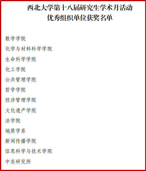近日,学校公布了第十届研究生学术月活动优秀论文和优秀组织单位获奖名单。我院荣获优秀组织单位薛婷婷等五名同学的论文被评为优秀论文
