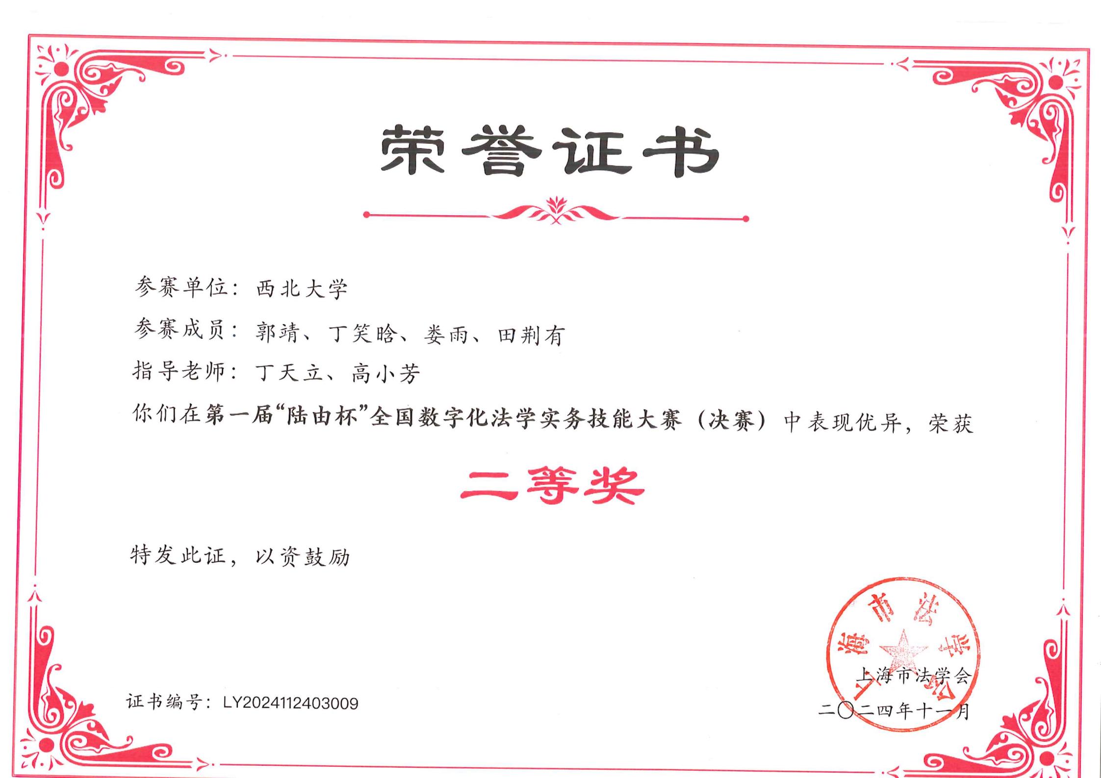 2024年11月23日至24日,第一届“陆由杯”全国数字化法学实务技能大赛总决赛成功举办。总决赛中,来自全国各高校的41支优秀队伍齐聚上海财经大学,经过线上系统竞赛和现场答辩两个环节精彩绝伦的较量,最终决出特等奖8支队伍、一等奖9支队伍和二等奖24支队伍。最终,我院研究生参赛队伍荣获二等奖。