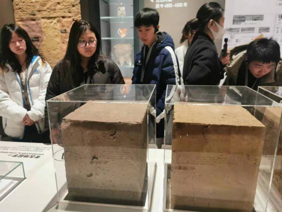 在讲解员的带领下,实践团队伍首先迈进了第一展厅——“考古历程”,从远古时期的钻木取火到文字文明的诞生,从奴隶制国家向封建社会的演变,从寻常百姓到皇室贵胄,从太平盛世到战火纷飞,从文武百官到国祚绵长。这里有大汉光耀千古的“文景之治”,有盛唐万国来朝的国富民丰,有宋制文运昌盛的清丽词作,也有元明清的百家故事与文物瑰宝。实践团跟随着讲解员的步伐,在这座长安古城的“灵魂客厅”里,倾听陈列品无声地讲述每段历史的变迁与文化记忆,其中亲手触摸文物的环节令同学们感受最深刻,现场同学说道:“亲手触摸到文物碎片的那一刻真的有种穿越时空和古代先贤对话的感觉,铜器上面的纹路虽然已经饱受岁月的侵蚀,但当体温与那段历史的余温重合的时候,那一刻我真的很骄傲自己是炎黄子孙。