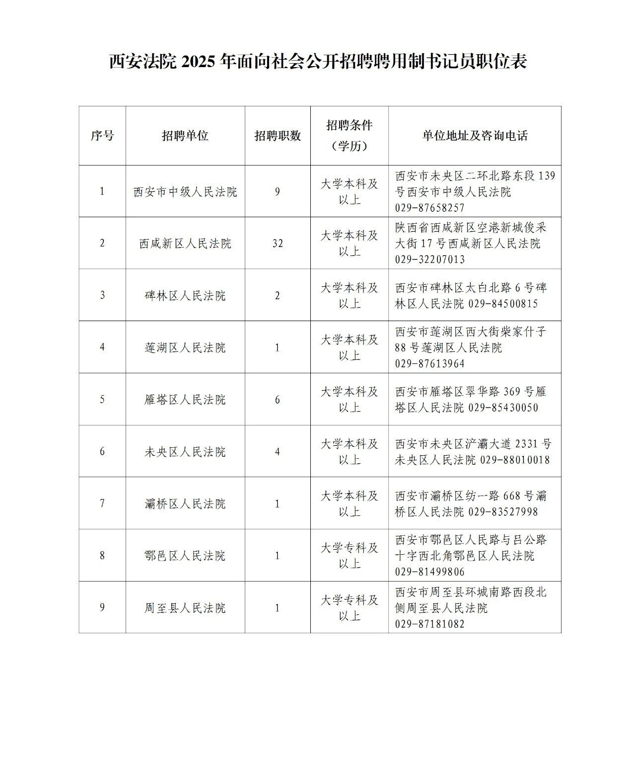 附件:《西安法院2025年面向社会公开招聘聘用制书记员职位表》