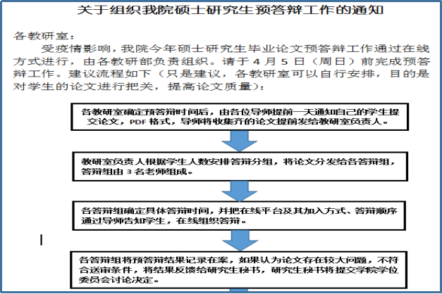 本次预答辩是在特殊的时期举行的,为了不影响学生的正常毕业,学院依据《77779193永利官网集团学位论文申请预答辩及论文抽检评议结果处理办法》等规定,给各教研部发布了《关于组织我院硕士研究生预答辩工作的通知》,要求各教研部通过在线视频会议等方式,精心组织师生,按期完成预答辩任务。