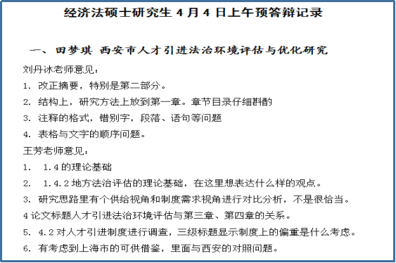 参加答辩的27名教师认真负责,从论文选题到结构安排,从内容摘要到关键词,从正文内容到引注规范等,对每篇论文进行了细致分析,并对存在问题一一指出,使在线答辩的同学受益良多。从目前答辩情况看,学位论文中尚存在一些共性问题:论文题目过于宽泛宏大;论文选题缺乏问题意识、逻辑结构欠妥;论文写作不太规范、案例分析不当等。预答辩结束之后,参加答辩的同学对各位老师的耐心指导表示感谢,并表示一定认真听取各位老师的意见和建议,对论文进行细致修改,高质量完成毕业论文写作。