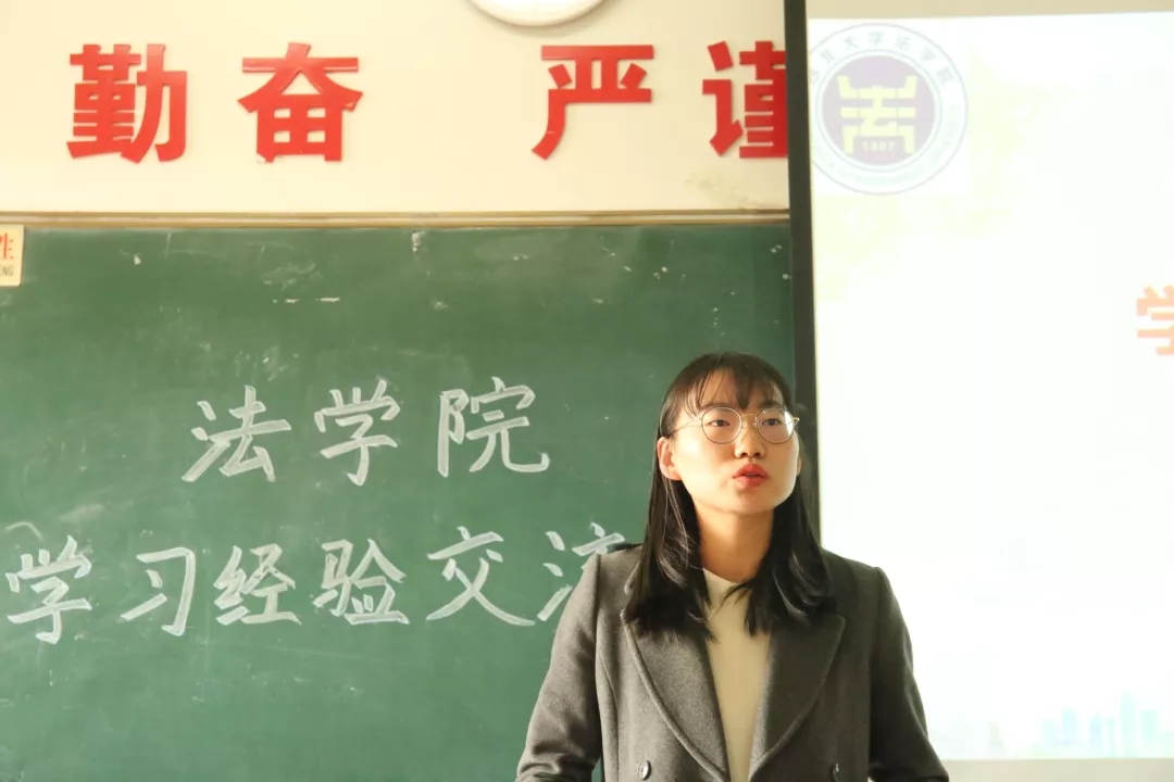 2019级研究生冯一向大家谈到了阅读以及写作的重要性,并鼓励大家多考取各类有益的证书,以增强自己的核心竞争力。2016级付晓慧主要分享了自己考研的经验。她认为:要考研应当提早做出规划,筛选自己的目标院校和专业方向,同时她还鼓励同学们应当积极参加课外活动,从而获得全面发展。2016级何泽宇讲到保研的相关事宜并分享自己的学习方法。她认为在复习时,我们要做到理解的同时也要注重强化记忆,学会做思维导图;上课时,要着重听老师对案例的分析和论述从而学会应用;保研方面,她讲述自己的规划并给大家分享了一些实用的app和公众号。2017级史春惠分享了一些平时的学习经验:建议大家走出舒适区,多去图书馆和自习室。合理安排自己的时间,把碎片时间充分利用起来适当考证,不要盲从,通过整理笔记找到适合自己的学习方法。2016级姜希驹分享了国奖、保研的相关经验,并提出在大一、大二要根据自己的保研目标提前制定相关计划,进行有针对性的准备。2016级王双权则从法考复习这一角度提出自己的建议,包括如何进行高效的复习、练习等等,并向大家推荐了对法考复习有帮助的软件、公众号等。
