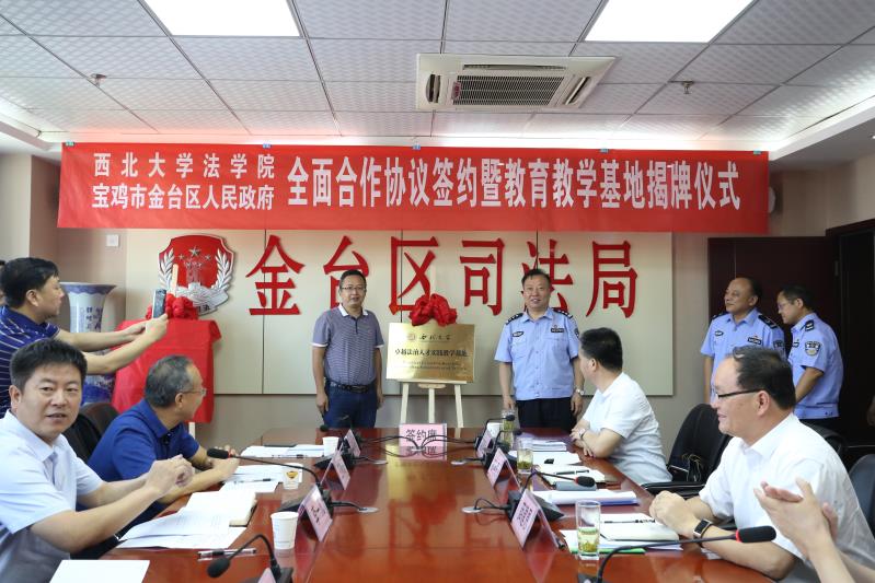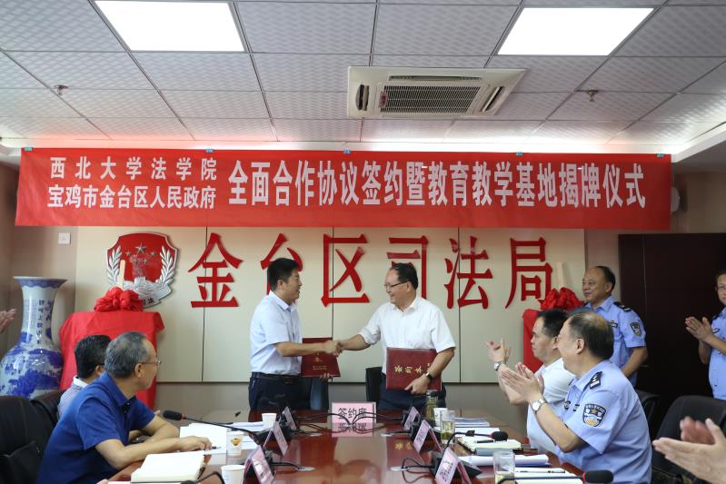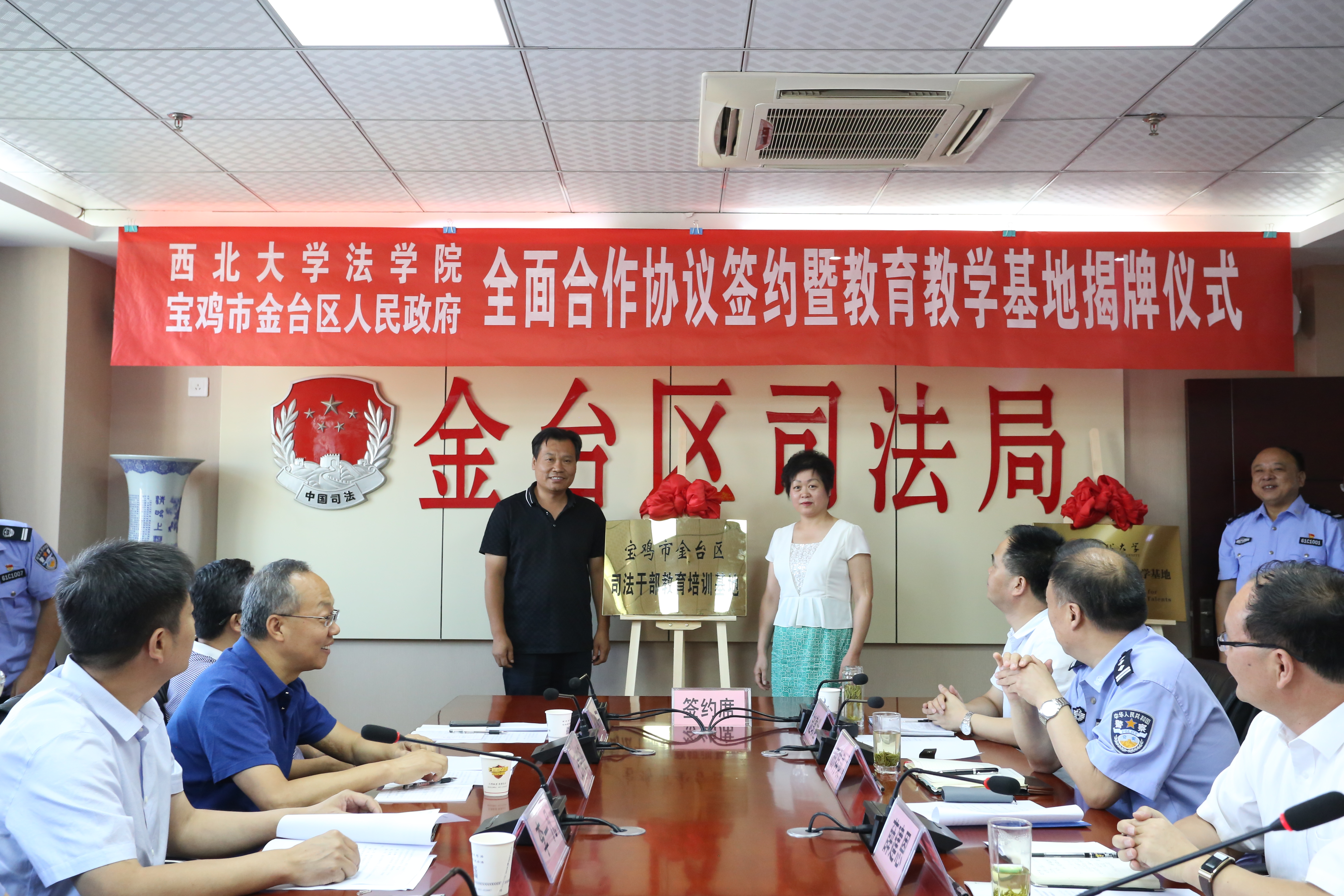 8月16日上午,我院与宝鸡市金台区人民政府校地全面合作协议签约暨教育教学基地揭牌仪式在宝鸡市金台区隆重举行。我院党委书记李一凡、副院长代水平、成剑、王鸿貌教授、潘怀平教授、金台区区委副书记、区长薛建恩,区委常委、政法委书记张晓辉,宝鸡市公安局正县级侦查员、副区长、金台公安分局党委书记、局长田存录,副区长崔琳,区人民法院党组书记、院长赵敦世,区司法局党组书记、局长牛怀仁、区检察院副检察长马长林、区委组织部常务副部长周红丽等部门领导30余人参加了会议。签约仪式由金台区区委常委、政法委书记张晓辉主持。