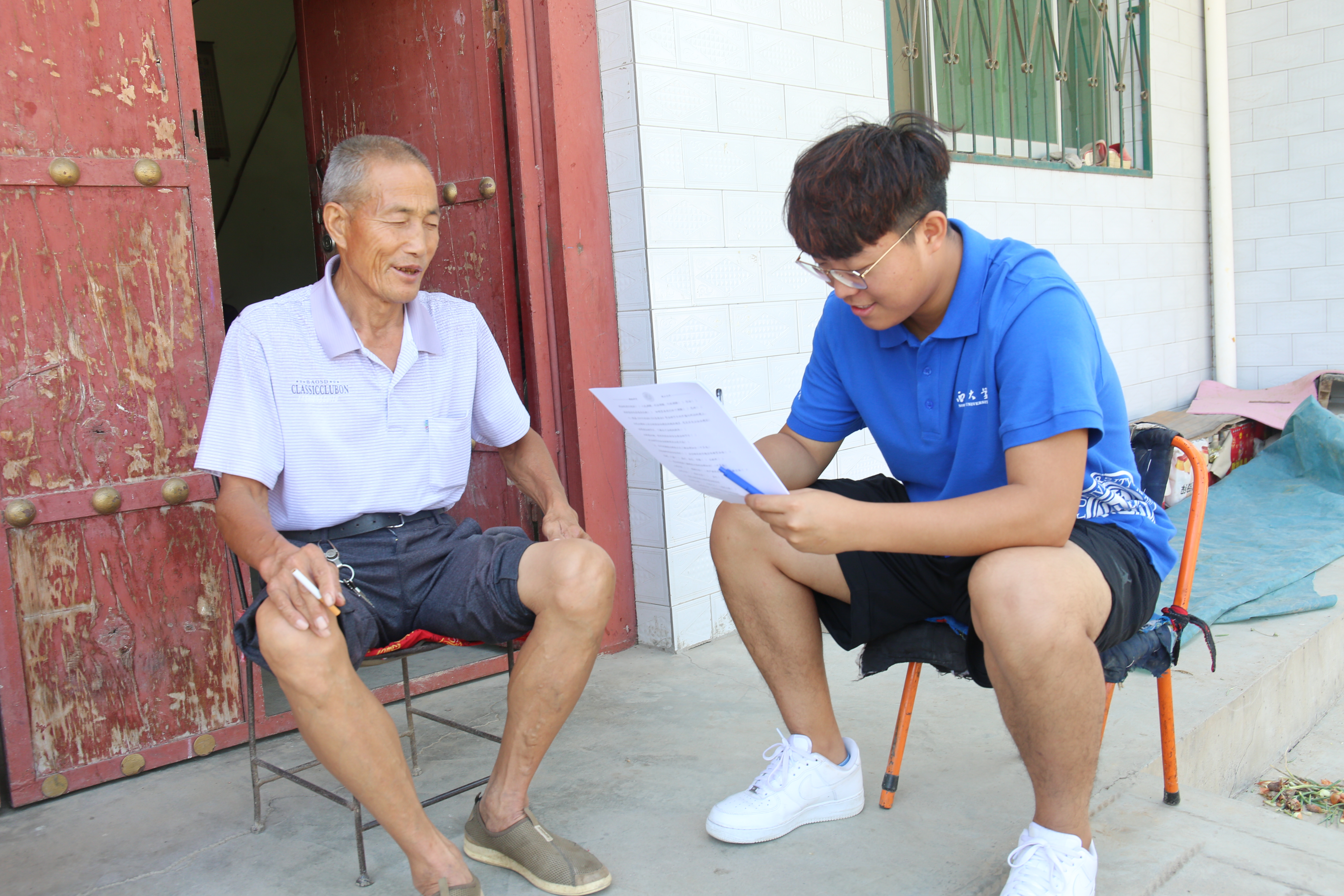 在蒲城县孙镇甘北村,队员们带上调查问卷开始实地走访。村子里现在居住着较多知识水平较低的老年人和他们的孙辈,对法律的认知较为模糊,有时也无法运用普通话进行交流,于是队员们利用生活中常见的案例生动地向村民们讲解法律问题。在走访调研中,队员们不仅能够感受到村民们的热情招待,也能切身感受到法律在乡村实践中面临的困难。在以老年和幼年群体为主的农村,如何依靠法律维护农民的权益,普法宣传在农村该如何创新形式等问题是我们无法逃避的,这也是法律人需要不断运用自身智慧和实践经验解决的社会难题。