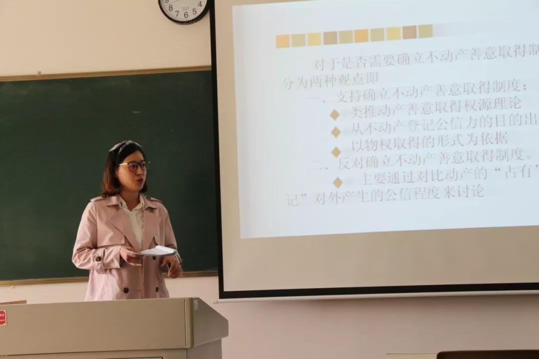 第一位上台作学术报告的是李美蓉同学。首先,她进行简单的自我介绍后,热情的分享了自己关于不动产登记簿的公信力和不动产的善意取得制度的研究。卞辉老师老师点评到,虽然李美蓉同学在该部分有了一定的研究,但对于不动产善意取得部分仍然有所欠缺,并畅谈了自己的理解和观点,提出了一些精准的建议。