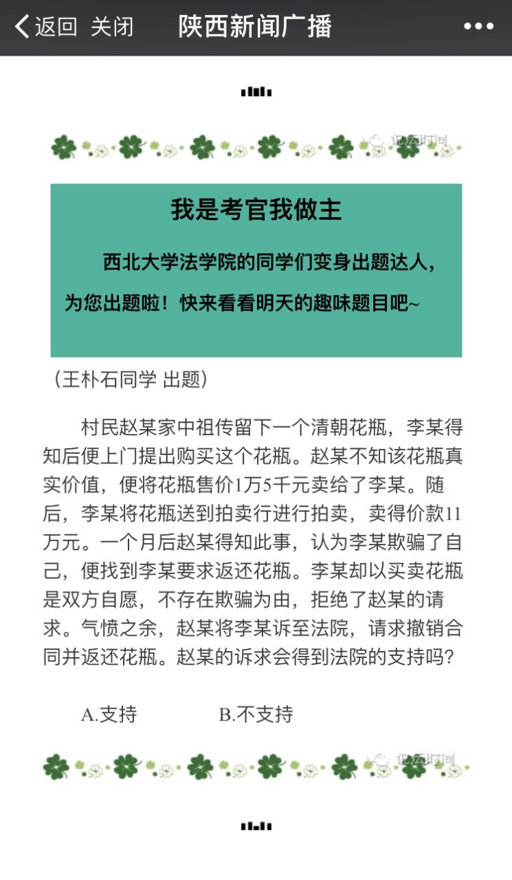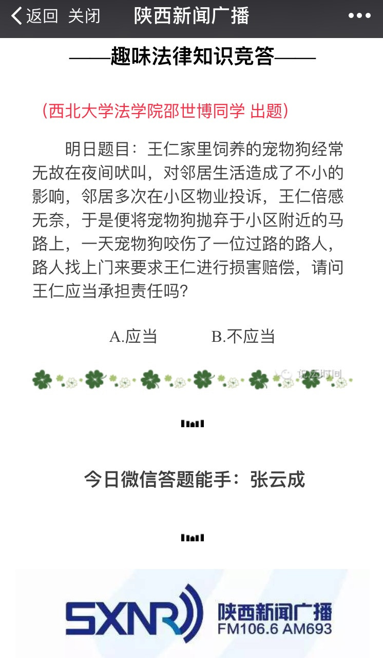 为贯彻落实党中央对全民普法教育工作给予的要求和希望,深入开展法制宣传教育,弘扬社会主义法治精神,增强全社会学法、守法、用法意识,提高“铸·法中国——宪法日系列活动”的社会影响力与知名度,我院特与陕西新闻广播《说法时间》节目联合推出 “2016全省趣味法律知识竞赛”活动,将通过“趣味不失专业、活泼生动的法律知识竞答”吸引全省听众参与。
