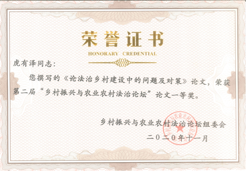 本次论坛由西安财经大学永利集团、期刊管理中心、陕西省律协三农委主办,西北政法大学基层司法研究所、西安市长安区人民法院、陕西至正律师事务所协办,是全面实施乡村振兴战略与深化农业农村改革背景下,以“乡村振兴与农业农村法治”为主题的研讨会。会议期间对参会论文进行评奖,我院虎有泽教授撰写的《论法治乡村建设中的问题及对策》的论文获得论坛一等奖。研讨会一致认为,在全面乡村振兴背景下,承包地“三权分置”、宅基地“三权分置”、农村集体产权制度改革、集体经营性建设用地入市、粮食安全等问题,仍是农业农村改革中的热点和难点,并呼吁加强理论研究与法治实践的紧密结合,推进“三农”领域研究的进一步深入。