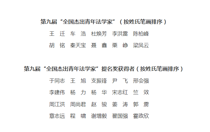 近日,中国法学会第九届“全国杰出青年法学家”评选委员会办公室正式公布了第九届“全国杰出青年法学家”和提名奖获得者名单。我院93级校友王迁教授、97级支振锋校友名列其中,分别荣获第九届“全国杰出青年法学家”和提名奖。