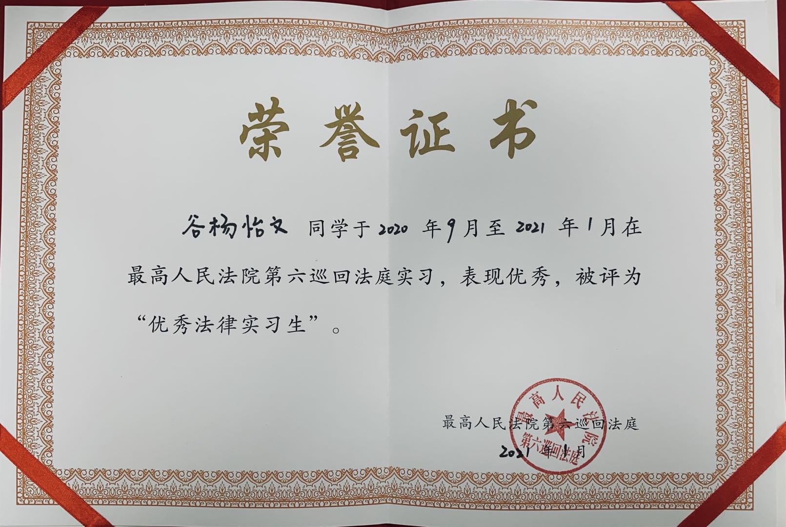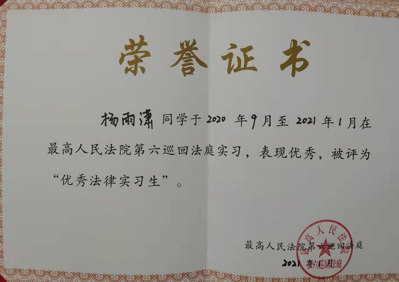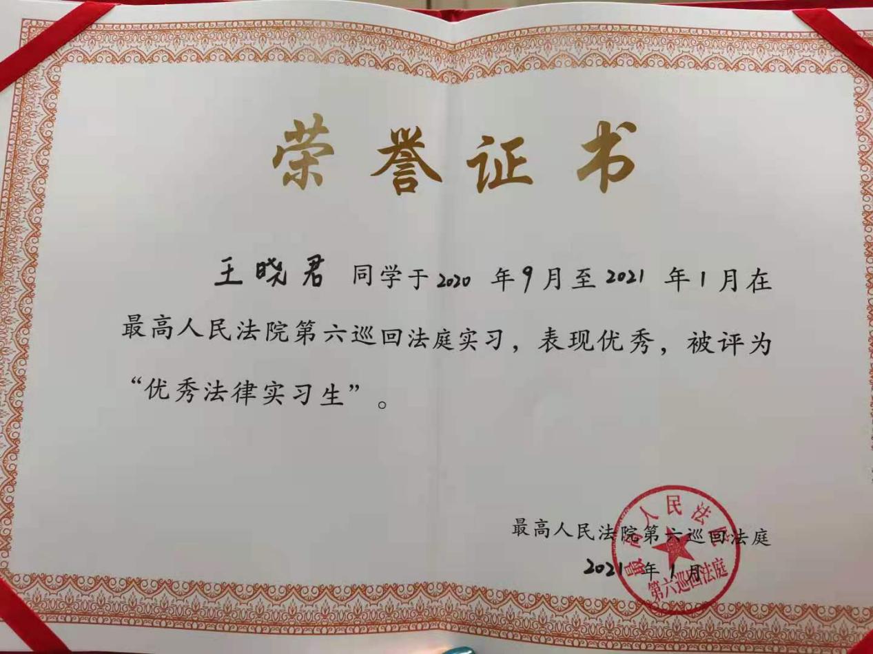 我院四名研究生被评为最高人民法院第六巡回法庭优秀法律实习生