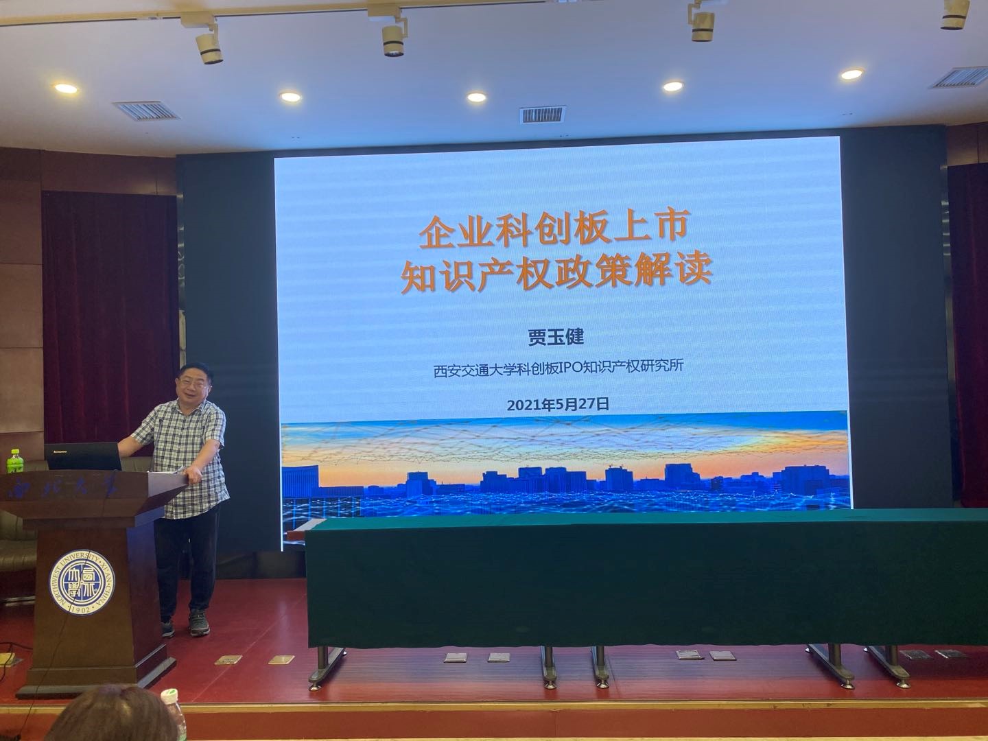 开班仪式结束后,西安交通大学贾玉健教授为培训班主讲“企业科创板上市知识产权政策解读”。贾老师介绍了科创板设立的背景、科创板法规政策支撑体系,总结了科创板的特点,并结合法律的规定,逐一介绍了科创板首发上市的条件与标准,从信息披露的一般要求、披露信息的具体内容、问询及落实函的答复等方面讲述了科创板企业上市对知识产权信息披露的要求,同时,贾老师还对科创板上市相关扶持政策尤其是陕西省扶持政策进行了总结。
