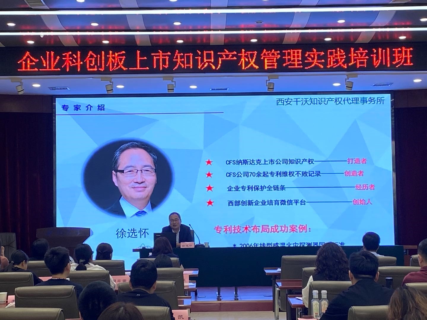 随后,西安千沃知识产权代理事务所负责人徐选怀老师为培训班主讲“科创板拟上市企业的知识产权合规应对”。徐老师从定义、特点、来源、保护路径等方面,对科创板企业的定位以及其应拥有的核心技术进行阐述,并围绕着主营产品,结合实践中的案例,对科创板企业的知识产权保护和竞争优势等内容进行讲解,同时,还从内涵界定、人事管理、激励管理以及其兼职等多个方面,对核心技术人员进行了解读。