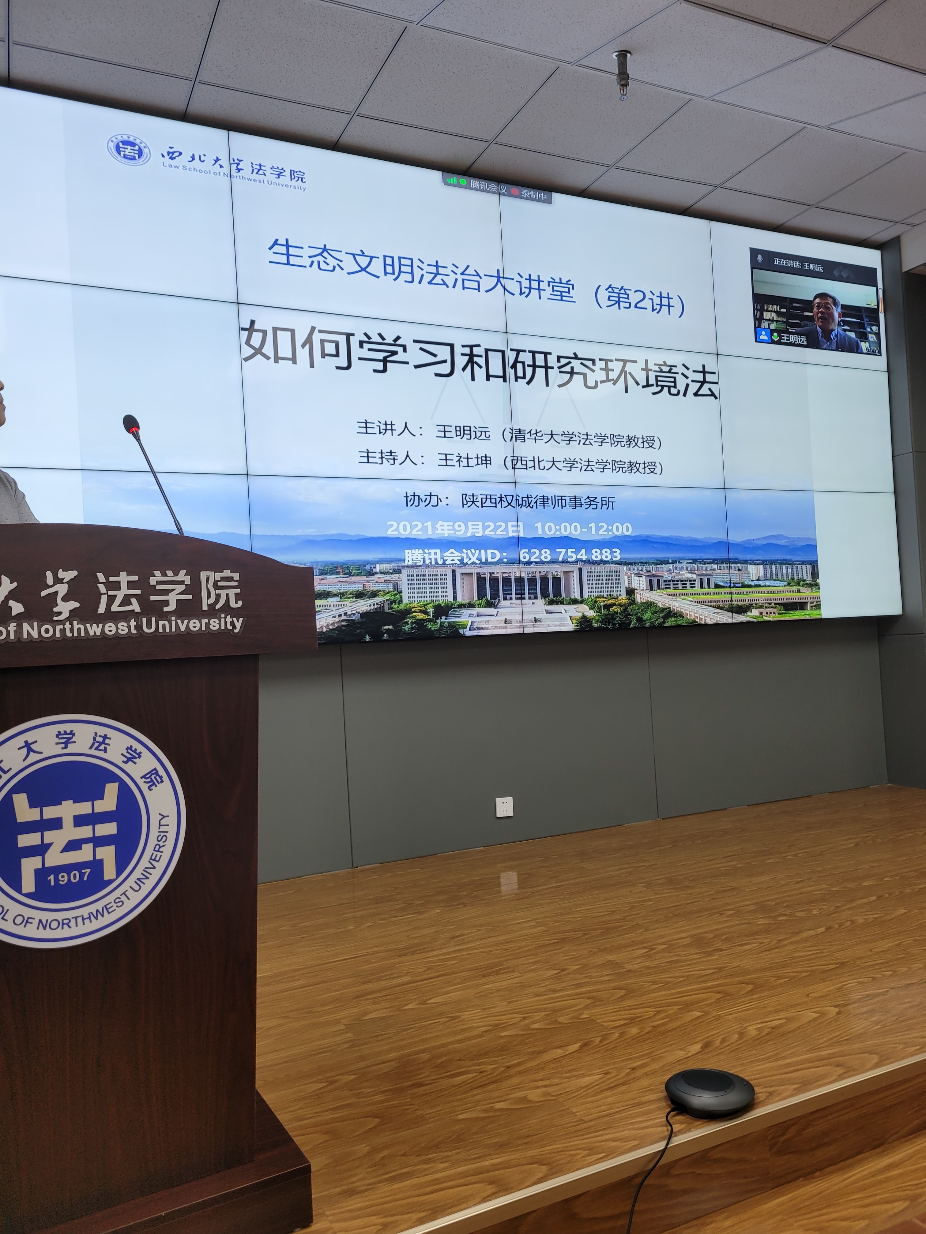2021年9月22日上午,清华大学永利集团王明远教授应邀做客生态文明法治大讲堂(第2讲),在线为我院师生作题为“如何学习和研究环境法学——以环境行政法学为例”的学术报告。学院环境与资源保护法学教研部主任王社坤教授出席并主持了讲坛。学院教师代表戴炜、朱艳丽、焦琰、任洋以及本科生、研究生共计100余人齐聚西学楼报告厅聆听了报告。此外还有来自北京大学、清华大学、中国人民大学、中国政法大学、中国社会科学院大学、中南财经政法大学、西北政法大学、北京林业大学、郑州大学、华侨大学等院校的140余名师生线上参会。
