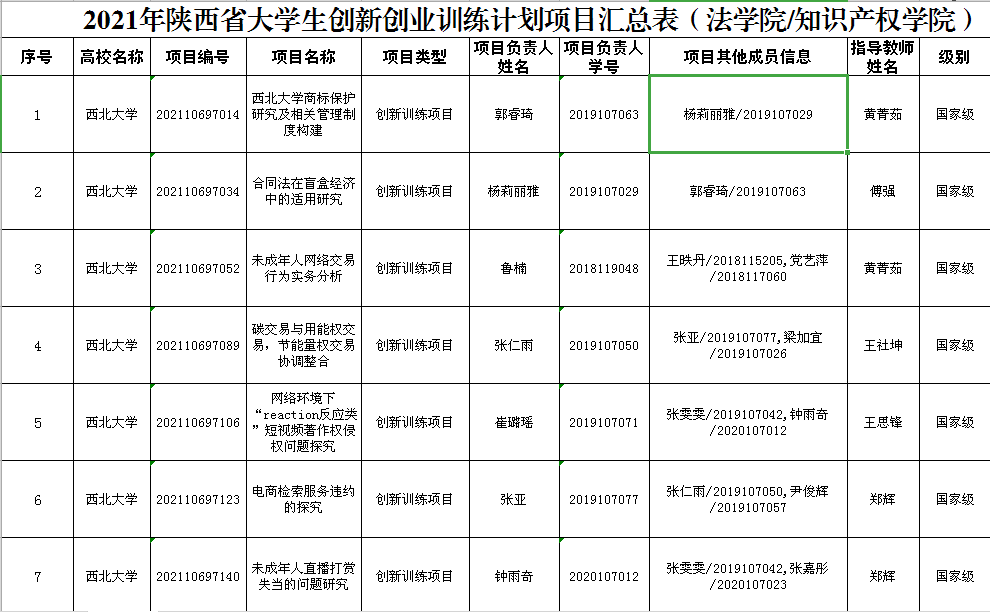 2021年永利集团陕西省大学生创新创业训练计划汇总表.xlsx
