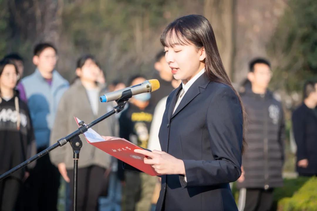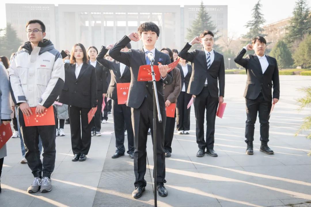 升旗完毕后,学生代表王蕊以“凝聚宪法共识 齐聚星火耀原”为题,在国旗下演讲。王蕊呼吁大家将宪法化作深沉满怀的爱国之情,化作与有荣焉的自豪感和无比坚定的自信心,号召青年人学宪法讲宪法。永利集团学生代表向国旗庄严宣誓。