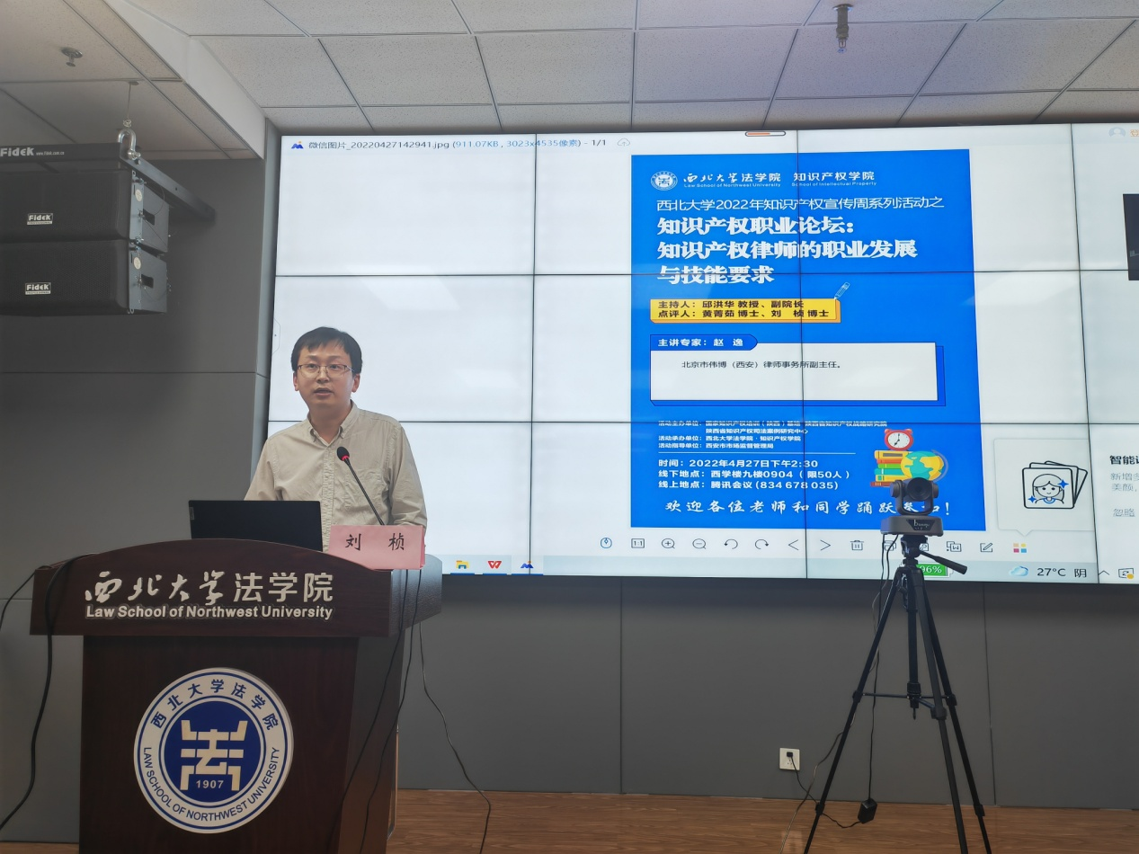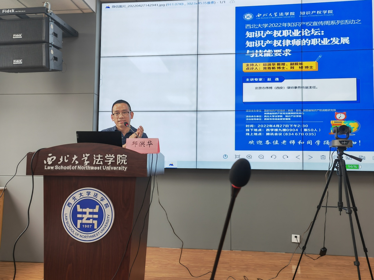 4月27日,永利集团2022年知识产权宣传周系列活动之一“知识产权律师的职业发展与技能要求职业论坛”在线上腾讯会议与线下西学楼0904报告厅同步举行。此次论坛由国家知识产权培训(陕西)基地、陕西省知识产权战略研究院以及陕西省知识产权司法案例研究中心共同主办。论坛由77779193永利官网集团·知识产权学院副院长邱洪华教授主持,邀请了北京市伟博(西安)律师事务所副主任赵逸老师作为本次论坛的主讲嘉宾,并由刘桢老师作为论坛的点评人。来自77779193永利官网集团·知识产权学院的本科生和研究生共计50余人参加了本次论坛。