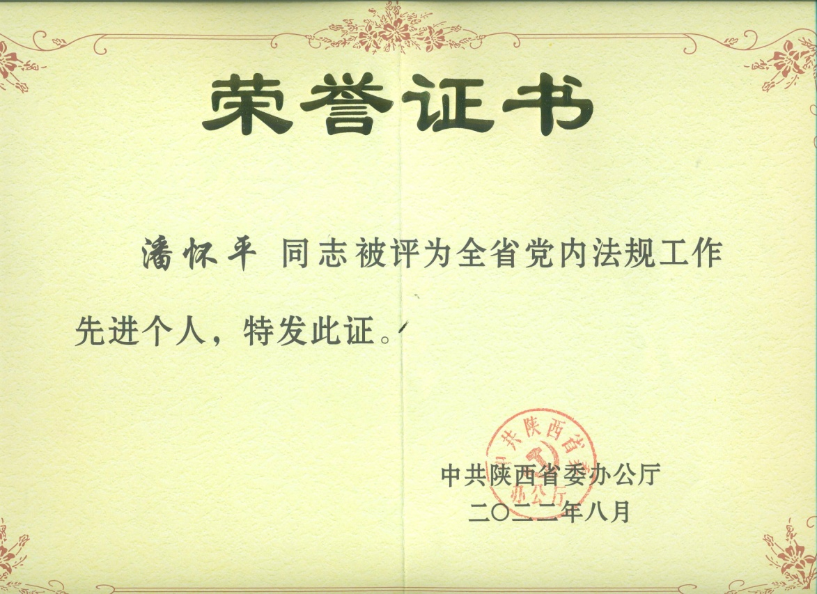 近日,经省委同意,中共陕西省委办公厅决定表彰全省党内法规先进集体47个、先进个人58名。我院潘怀平教授获得“全省党内法规工作先进个人”荣誉称号。