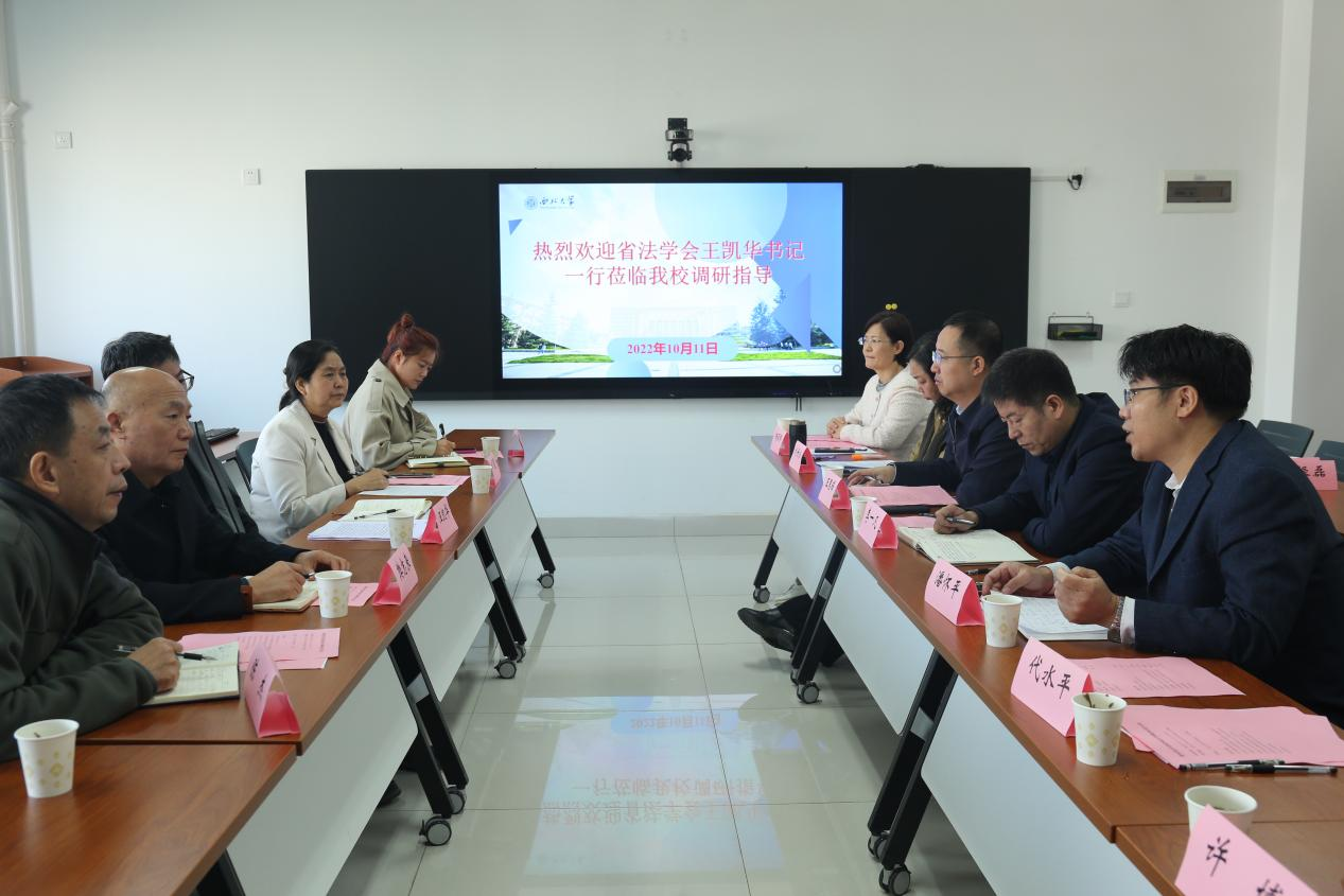 2022年10月11日上午,陕西省法学会党组书记王凯华一行来我院进行调研,和学院负责人以及省法学会挂靠我院各研究会负责人进行座谈。陕西省法学会党组成员、一级调研员樊志来,党组成员、研究部主任申月霞,研究部副主任陈杰,永利集团党委常委、副校长吴振磊,国内合作与永利集团处处长崔延力,永利集团党委书记李一凡,院长王思锋,陕西省法学会法经济学研究会会长刘丹冰教授,陕西省法学会卫生法研究会会长杨丽珍教授,陕西省法学会党内法规研究会会长潘怀平教授,学院代水平副院长、许博副院长参加会议。座谈会由院长王思锋教授主持。