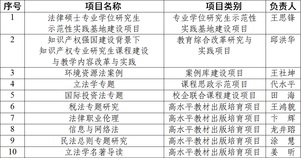 近日,校研究生院公布了2022年度研究生培养质量提升项目立项名单,我院申报的多个项目获准立项。其中,王思锋教授负责的“法律硕士专业学位研究生示范性实践基地建设项目”获批专业学位研究生示范性实践基地建设项目、邱洪华教授申报的“知识产权强国建设背景下知识产权专业研究生课程建设与教学内容的改革与实践”获批教育综合改革研究与实践项目、王社坤教授申报的“环境资源法案例”获批研究生案例库建设项目、代水平副教授申报的“立法学专题”获批研究生课程思政示范项目、田海副教授申报的“国际投资法专题”获批研究生校企联合课程建设项目。之前,我院获批五项“研究生高水平教材出版培育项目立项”,分别是王鸿貌教授的《税法专题研究》、卞辉副教授的《法律职业伦理》、龙井瑢副教授的《信息与网络法》、涂慧副教授的《民法总则专题研究》、姜昕副教授的《立法学名著导读》。上述项目的立项建设将有力促进我院研究生教育教学改革,提升研究生培养质量。