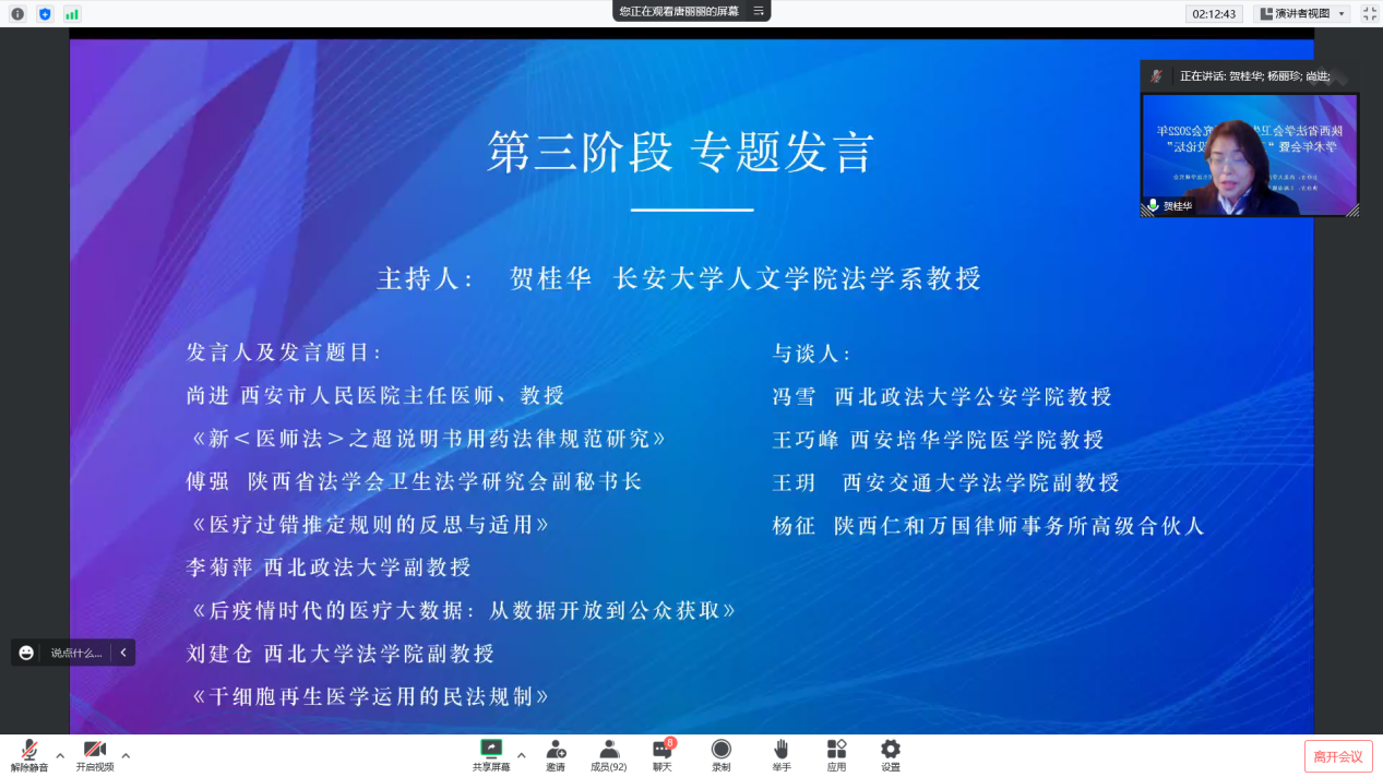 大会专题发言阶段,由陕西省法学会卫生法学研究会副会长、长安大学人文学院法学系贺桂华教授主持。