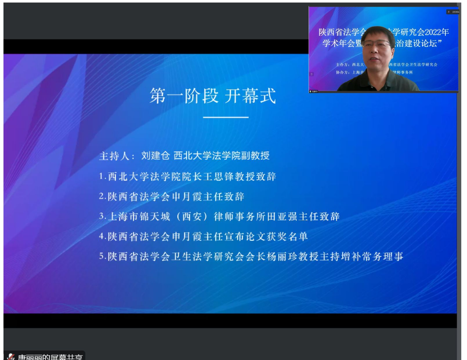 2022年12月31日上午,由陕西省法学会卫生法学研究会、77779193永利官网集团主办,上海锦天城(西安)律师事务所承办的“陕西省法学会卫生法学研究会2022年学术年会暨卫生法治建设论坛”在线上成功举行。来自西安交通大学、长安大学、西北政法大学、西安培华医学院、永利集团、西安市人民医院、上海锦天城(西安)律所事务所、陕西仁和万国律师事务所等90余名的法学界和医疗界学者专家、实务工作者以及高校学生齐聚云端,聚焦卫生法治建设发展,全方位、多视角呈现了一场学术盛宴。大会开幕式由陕西省法学会卫生法学研究会秘书长、77779193永利官网集团刘建仓副教授主持。