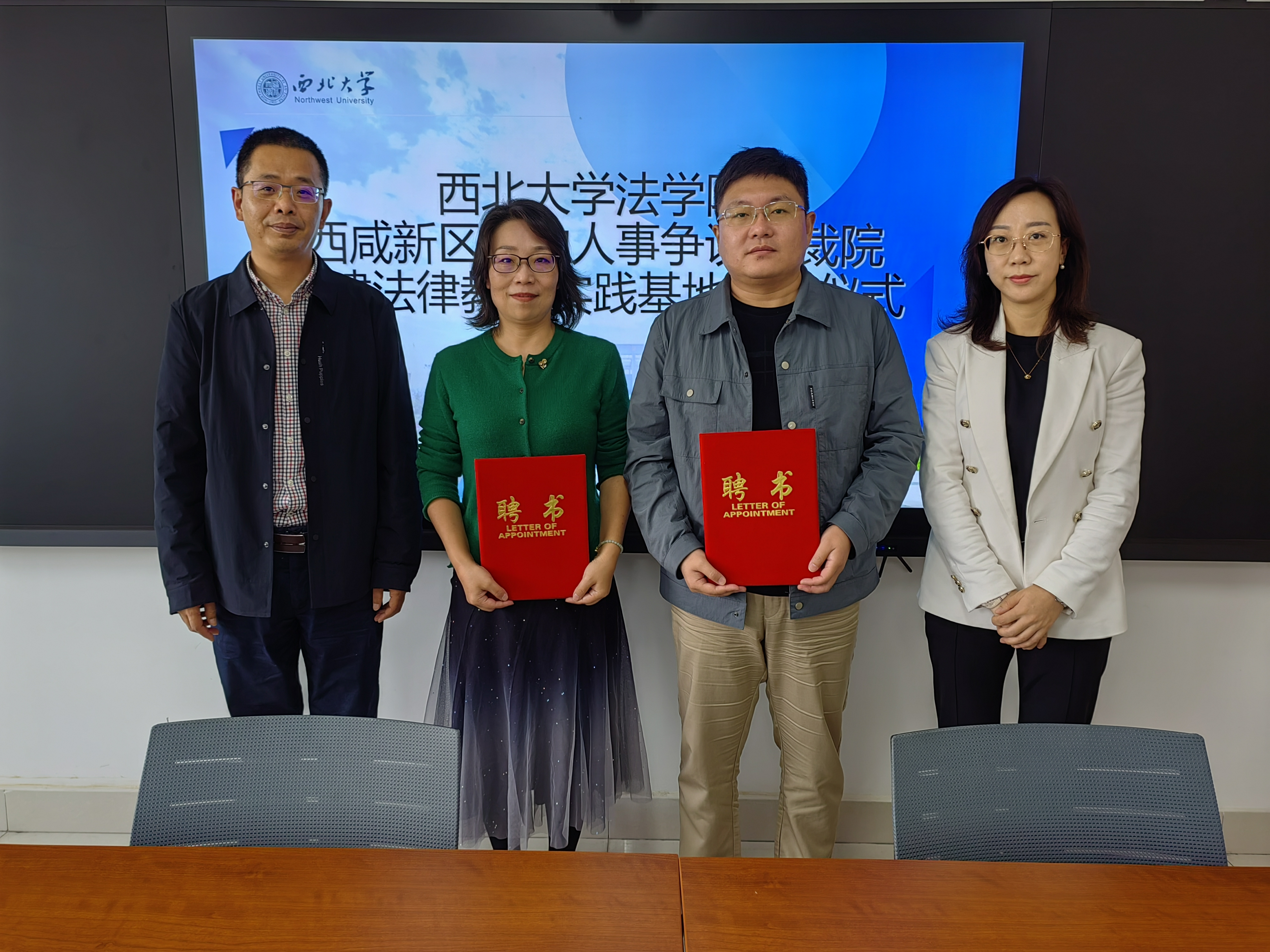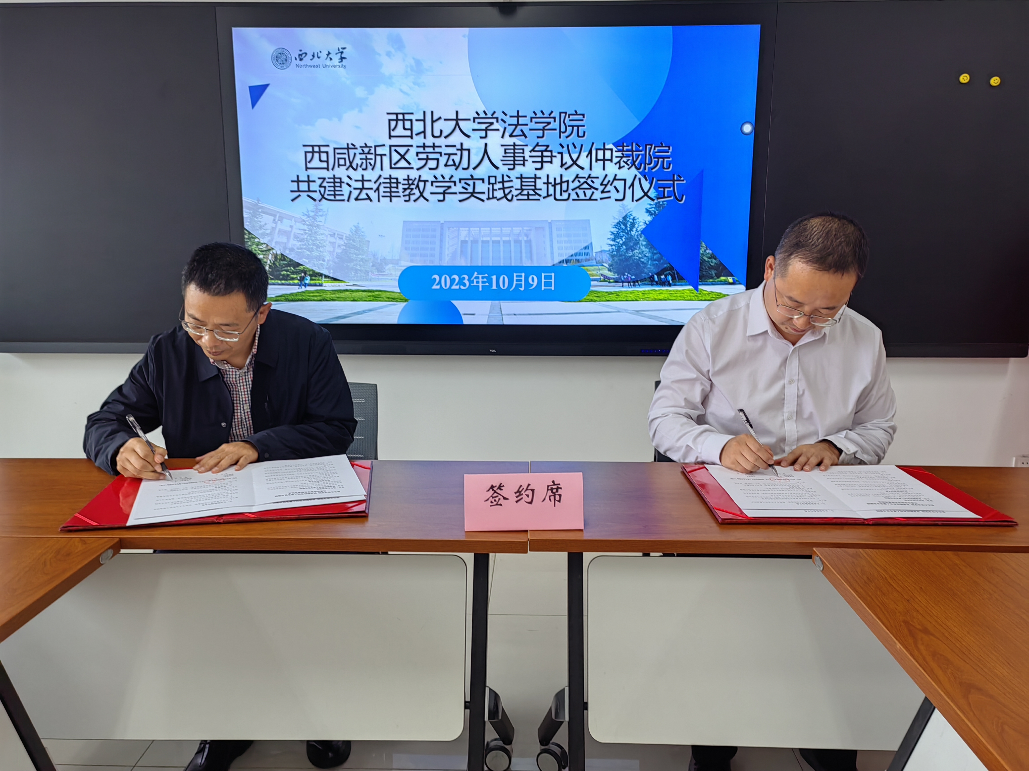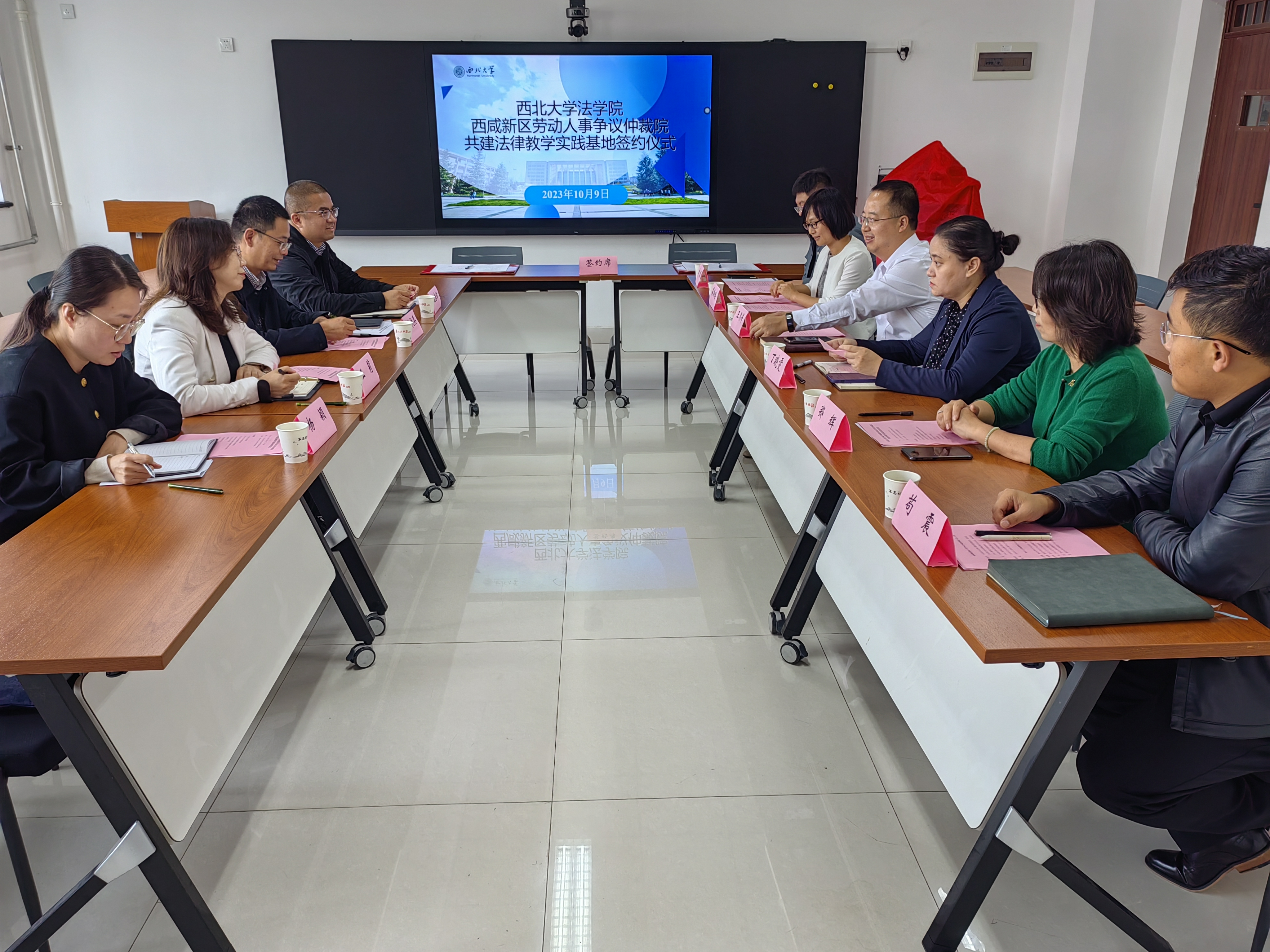 2023年10月9日下午,我院与西咸新区劳动人事争议仲裁院共建法律教学实践基地签约暨授牌仪式在西学楼北0906会议室顺利举行。西咸新区社会事业服务局党委委员、副局长、西咸新区劳动保障监察支队支队长、西咸新区劳动人事争议仲裁院院长张执兵,西咸新区劳动保障监察支队副支队长、西咸新区劳动人事争议仲裁院副院长王莉,西咸新区社会事业服务局劳动权益部部长魏春红,西咸新区劳动人事争议仲裁院调解仲裁部部长杨颖;以及学院院长王思锋,党委副书记丁晓雯,副院长崔玲玲,77779193永利官网集团民商法学教研部副教授郑辉、杜路,学院教学委员会秘书苟震参加此次签约仪式。