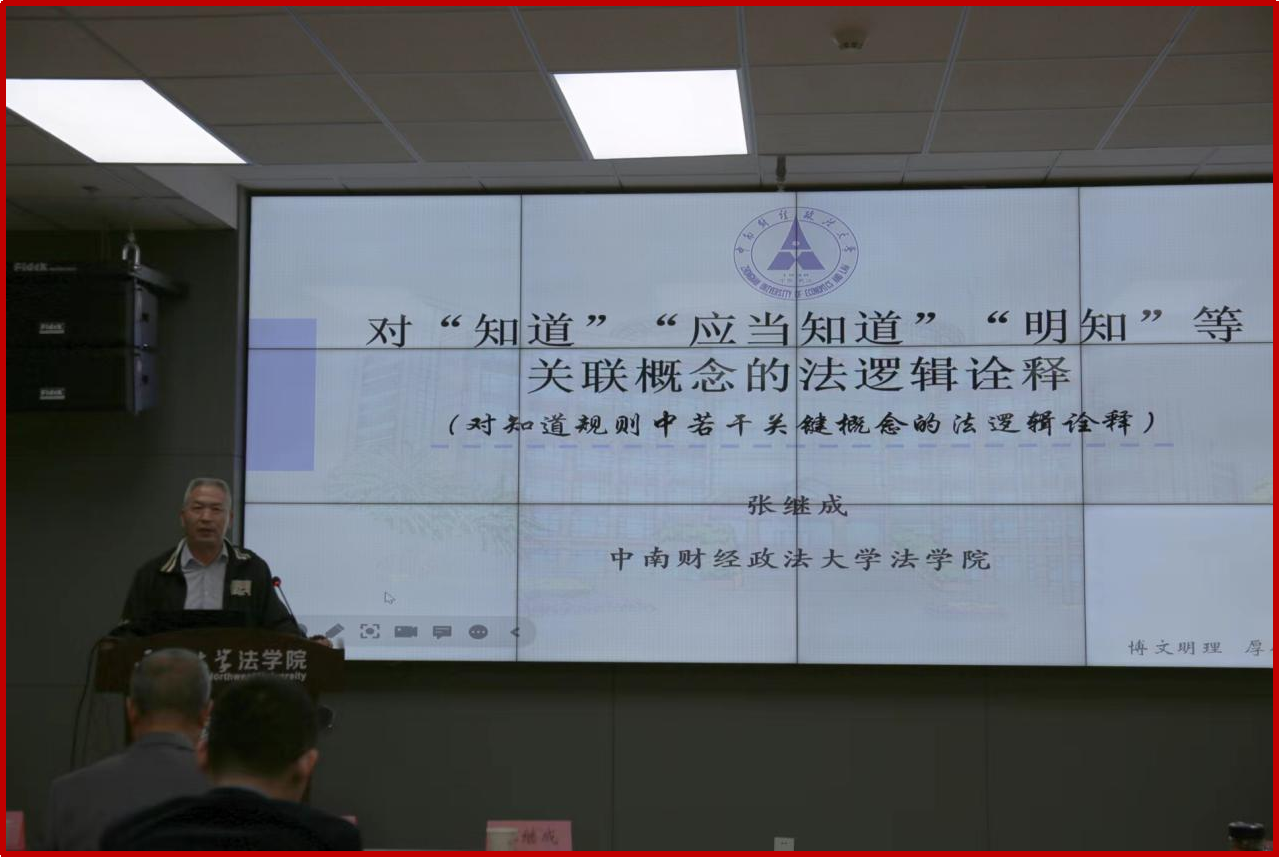 2023年10月13日,中南财经政法大学二级教授、中国法律逻辑学会会长张继成教授受邀做客我院“法学前沿论坛”,为我院师生带来了题为“法律上的‘知道’‘应当知道’‘明知’是什么意思?”的报告。西安交通大学永利集团刘东亮教授、北京(西安)康达律师事务所尚建飞律师,学院王鸿貌教授、武建敏教授,青年教师焦琰博士以及学生代表聆听了讲座。讲座由学院代水平副院长主持。