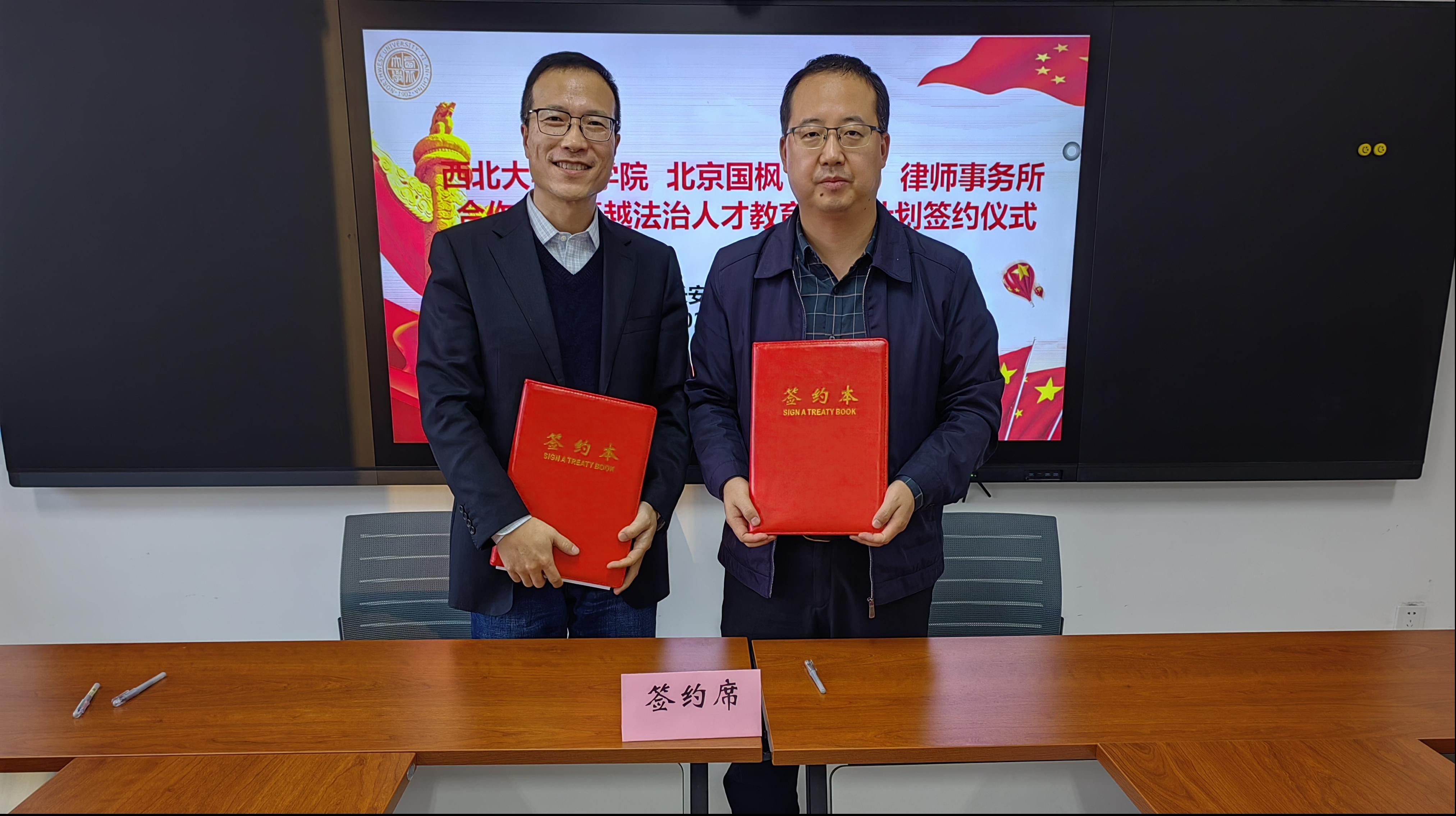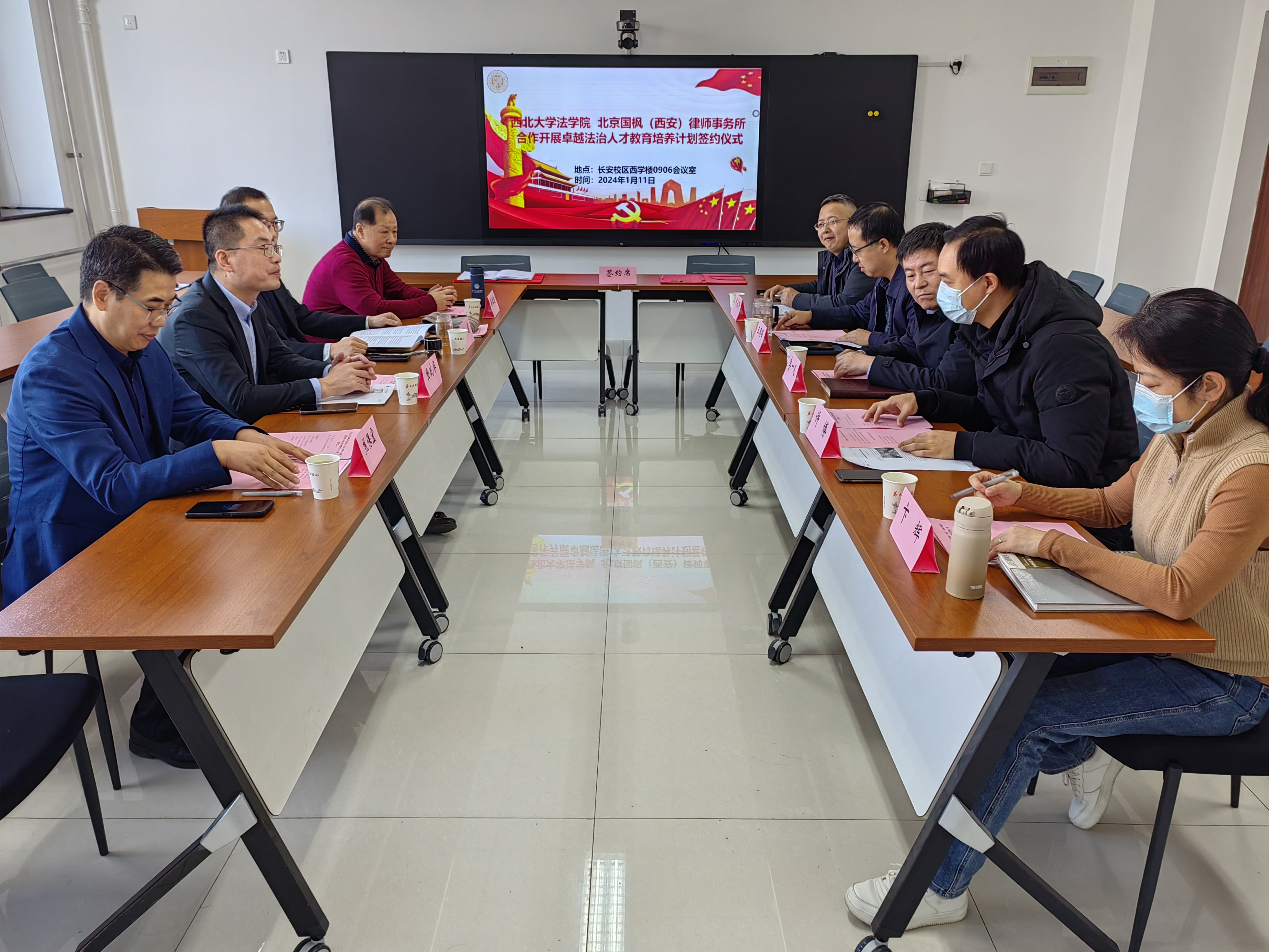 2024年1月11日下午,我院与北京国枫(西安)律师事务所合作开展卓越法治人才教育培养计划签约仪式顺利举行。北京国枫(西安)律师事务所主任王勇,副主任鱼武华,党支部书记兼副主任焦保宏,学院党委书记李一凡,院长王思锋,原党委书记胡征俊,副院长代水平、许博,工会主席卞辉参加了签约仪式。
