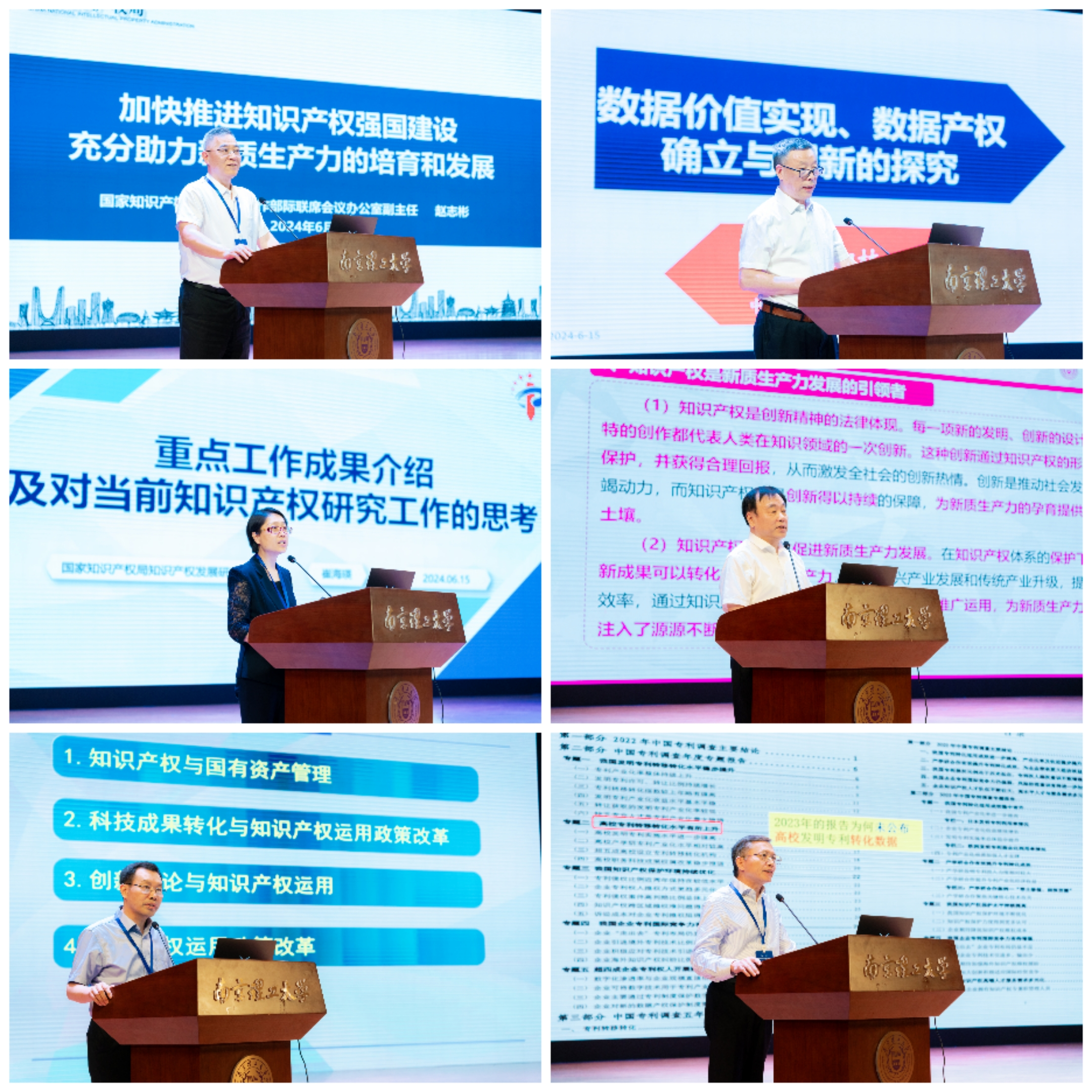 在主旨演讲环节,6位专家学者围绕本次论坛主题作了精彩报告。国家知识产权强国建设工作部际联席会议办公室副主任赵志彬作了题为“加快推进知识产权强国建设充分助力新质生产力的培育和发展”的报告,就知识产权强国建设纲要的出台背景和总体部署作系统介绍。中国科学学与科技政策研究会副理事长柳卸林教授作了题为“数据价值实现、数据产权确立与创新的探究”的报告,就科技成果改革的历史沿革以及目前面临的具体问题进行梳理,结合数字经济时代的特征,从创新视角出发分享了对于数据权属的思考。国家知识产权局知识产权发展研究中心副主任崔海瑛作了题为“重点工作成果介绍及对当前知识产权研究工作的思考”的报告,系统介绍了多份报告的重要研究成果,并从多个重点领域提出了对于未来知识产权研究工作的思考与展望。国家知识产权强国建设专家咨询委委员、江苏省知识产权局原局长、江苏知识产权研究院院长朱宇作了题为“知识产权引领江苏发展新质生产力的思考”的报告,就知识产权引领新质生产力发展的认识与目前存在的系统挑战展开讨论,并系统介绍了江苏以“五高五区”推进知识产权强省建设引领江苏新质生产力发展的探索。中国科学学与科技政策研究会知识产权专业委员会常务副主任、中国科学院大学教授宋河发作了题为“创新理论视角下的知识产权运用政策发展思考”的报告,从知识产权与国有资产管理的联系出发,分享了关于科技成果转化与知识产权运用政策改革和创新理论与知识产权运用的深刻思考。中国科学学与科技政策研究会知识产权专业委员会主任、同济大学特聘教授朱雪忠作了题为“对于我国促进高校专利转化政策的思考”的报告,就我国高校目前存在的专利成果转化率低难题,进行了客观深入的探讨。