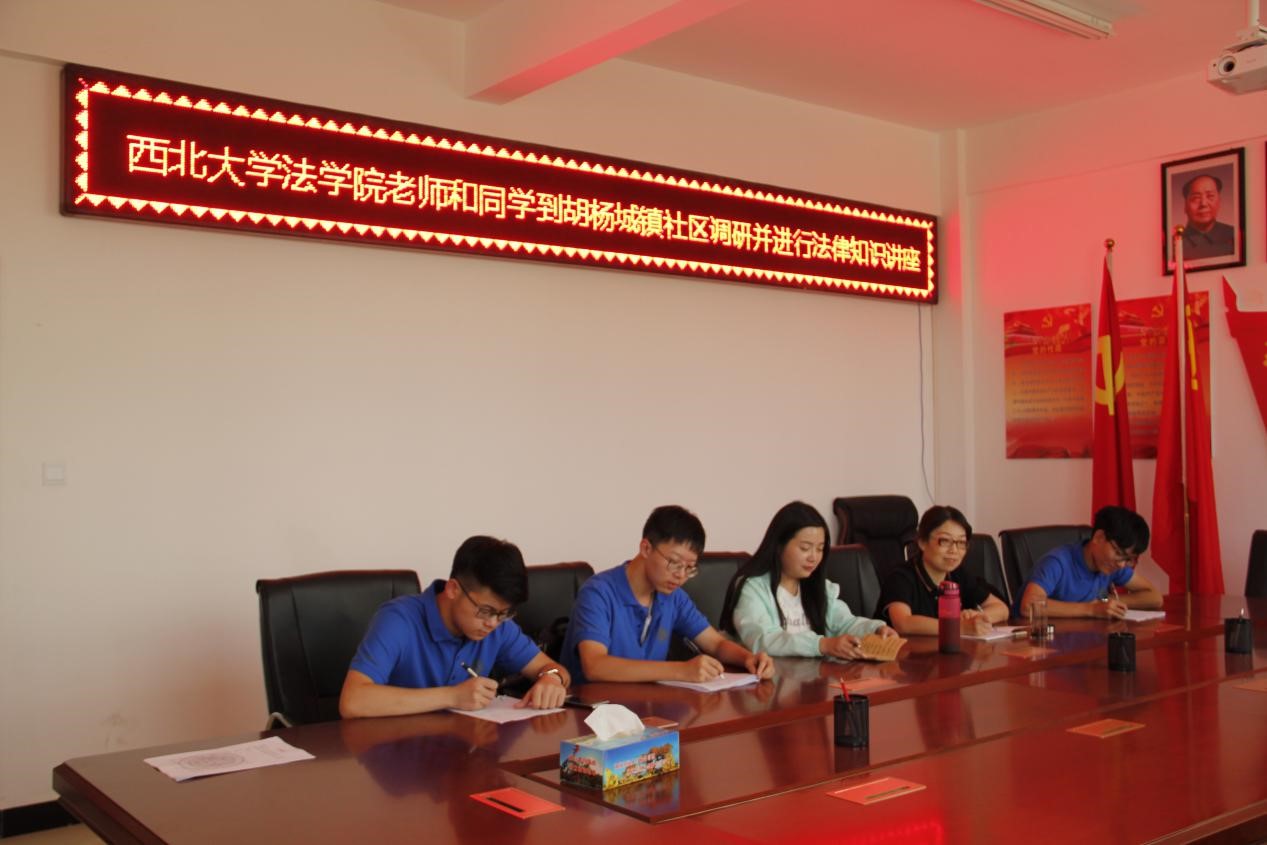 最后,普法实践团一行人驱车前往郭勒木德镇胡杨城镇社区,社区负责人组织召开了座谈会,向我们介绍社区情况。这是一个位于郊区的典型社区,其中大部分住户为城乡结合地区的农牧民。社区规模较大,约有6000多户人家,但因为精准扶贫政策的有效落实,居民们脱贫迅速,生活得到有效改善。通过社区负责人的讲解,我们进一步了解到当地扶贫政策的特色与优势,并就接下来几天中开展普法宣传工作的合作展开讨论。