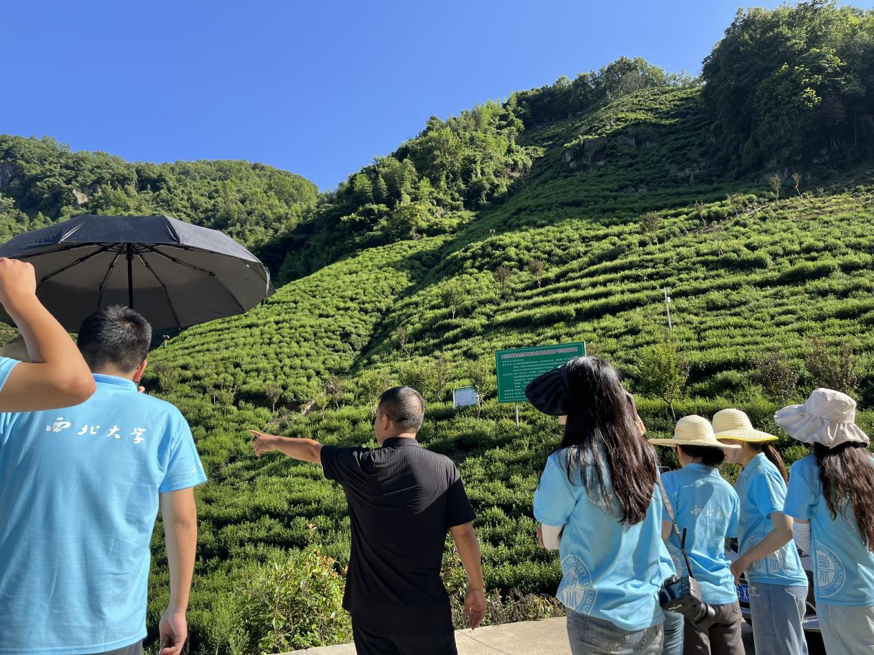 紧接着,实践调研团的老师和同学们前往紫阳县大连村示范茶园参观。大连村示范茶园坚持“农艺为先、科学施肥、绿色植保、生态融合、工艺突出”的工作思路,与中国农业科学院茶叶研究所开展合作,通过山地轻简化机械作业、病虫害绿色防控、优质茶标准化加工提质等核心技术,探索出“一季采茶,三季养树”的高效生产模式。通过实地考察,实践调研团对茶叶生产中鲜叶采摘、茶树修剪、树冠养护、茶树施肥等种植知识有了深入了解。在茶园参观结束后,调研团成员认为茶叶种植过程中要增质提效,必须充分利用本地土壤富硒的自然条件,积极与科研单位展开合作,以技术创新为手段,以知识产权为保障,更好利用当地地理标志,才能真正做到因茶兴业,因茶致富。
