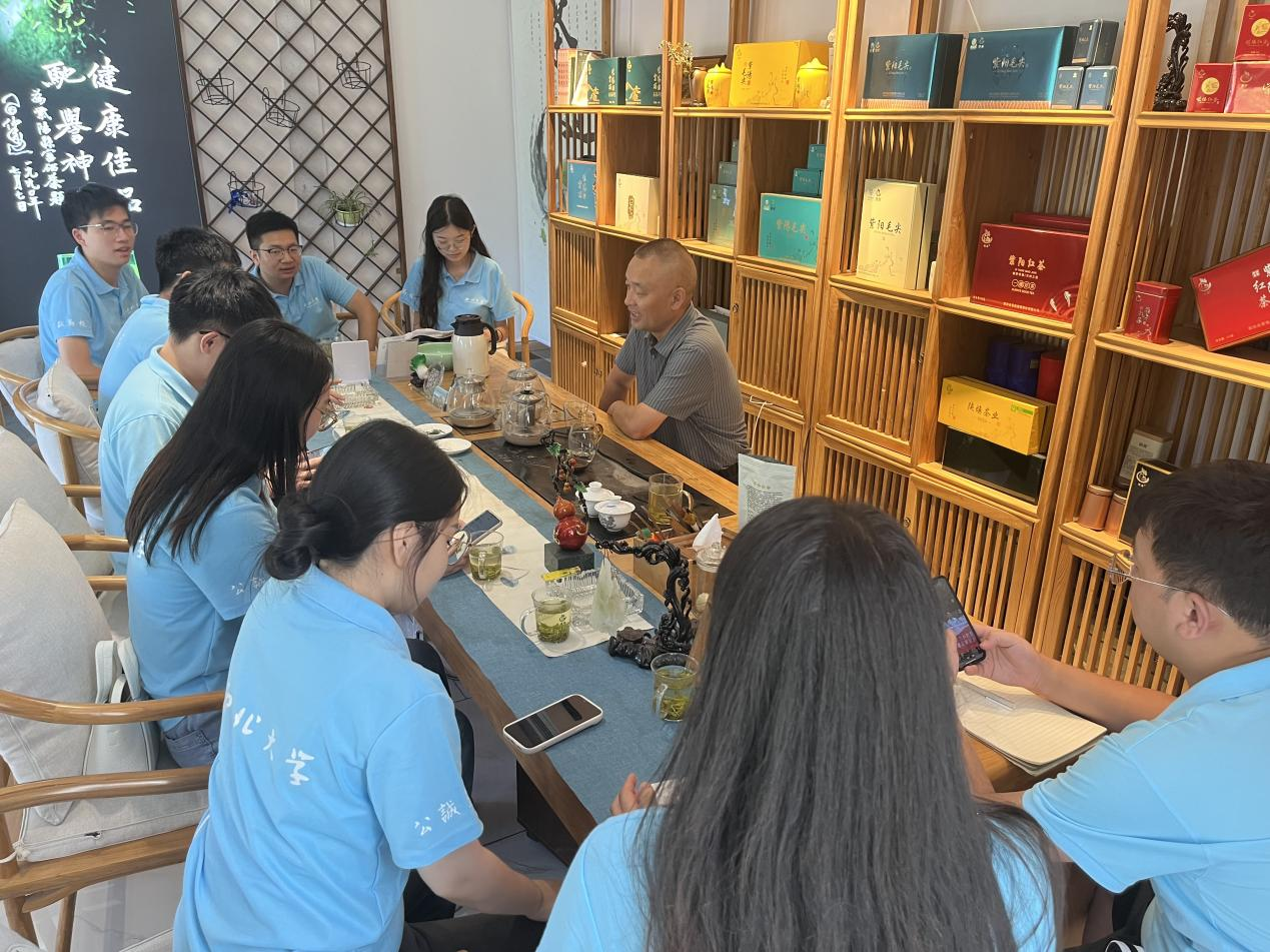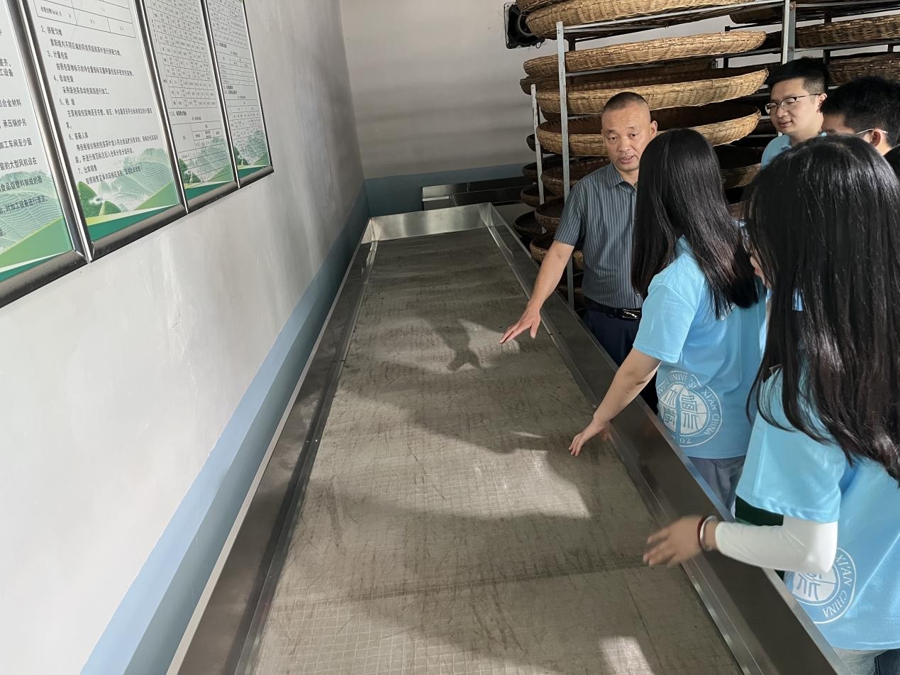 首先,实践调研团与紫焕茶业公司开展座谈会,紫焕茶叶公司负责人耐心地讲述了企业在日常经营过程中遇到的侵权问题,分享了企业依托线上线下的途径促进乡村振兴的宝贵经验、说明了企业使用涉农商标与专利的实际情况,并就如何依托紫阳富硒茶这一地理标志更好谋求发展进行展望。调研团就茶企提出的包装设计侵权、茶叶品牌冒牌行为等问题给出科学的法律建议,对涉农知识产权如何具体助力企业增收给出自己的看法与意见。随后,紫焕茶业公司负责人带领调研团参观茶叶生产流程,调研团成员了解到茶叶加工中杀青、揉捻、干燥、发酵等关键工序,对茶产业有了更深入的认识。