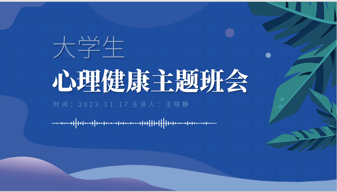 本次心理班会活动的主题在于“关注大学生心理健康”,活动主要内容将围绕着“什么是心理健康”“大学生一般会存在哪些心理健康问题”“如何调节心理健康问题”“了解亚心理健康相关知识”“心理健康小测试”等方面内容展开。旨在理论方面首先帮助让大学生了解问题并、直面问题、解决问题。