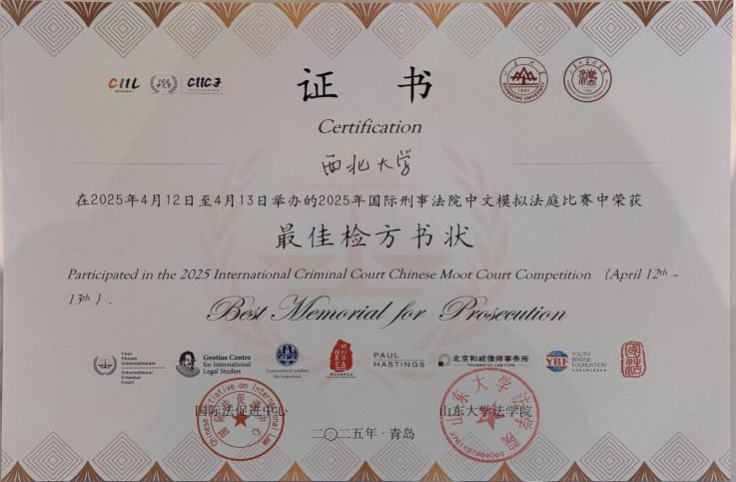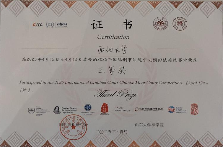 4月13日,2025年中国高校国际刑事法院模拟法庭竞赛在青岛圆满落幕,我院学子组成的代表队在本次竞赛中成功晋级全国总决赛并荣获“三等奖”,同时摘得“最佳检方书状”单项荣誉,实现学校在本竞赛中的零突破。