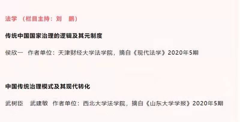 武树臣、武建敏教授发表在《山东大学学报(哲学社会科学版)2020年第5期的论文——《中国传统治理模式及其现代转化》继被《人大复印资料·政治学》2020年第12期全文转载后,近期又被《中国社会科学文摘》2021年第2期转载。