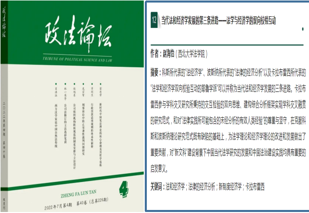 近日,我院赵海怡副教授独立撰写的论文《当代法和经济学发展的第三条进路——法学与经济学的双向校验互动》在法学类核心期刊《政法论坛》2022年第4期发表。《政法论坛》在近年来的中国法学核心科研评价来源期刊(CLSCI)排名中位居前列,在法学界享有很高的声誉。